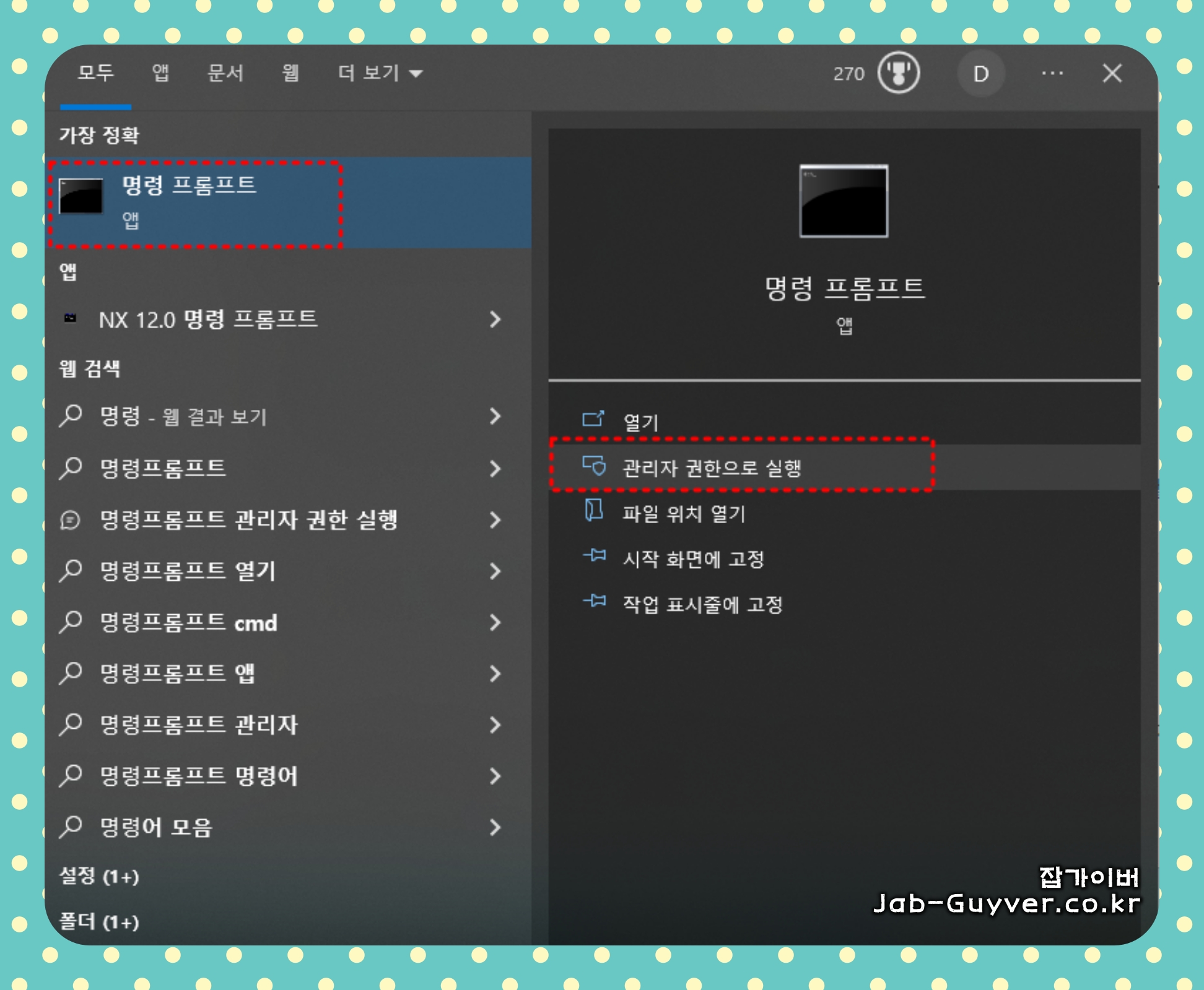시작 메뉴에서 "CMD"를 검색하고, "명령 프롬프트"를 관리자 권한으로 실행합니다. 이를 위해 "CMD"를 마우스 오른쪽 버튼으로 클릭하고 "관리자로 실행"을 선택합니다.