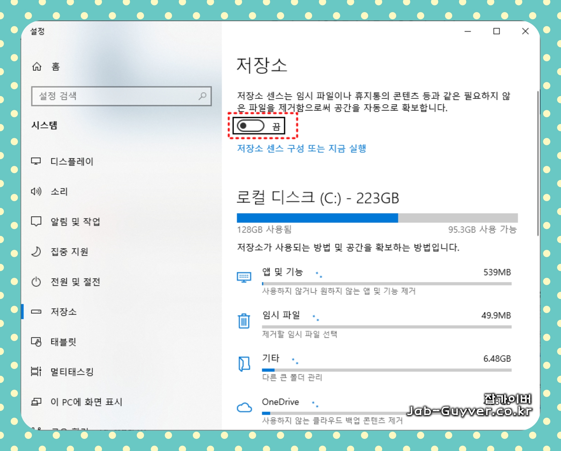윈도우10 저장공간 C드라이브 용량부족 - 저장소센스 활성화