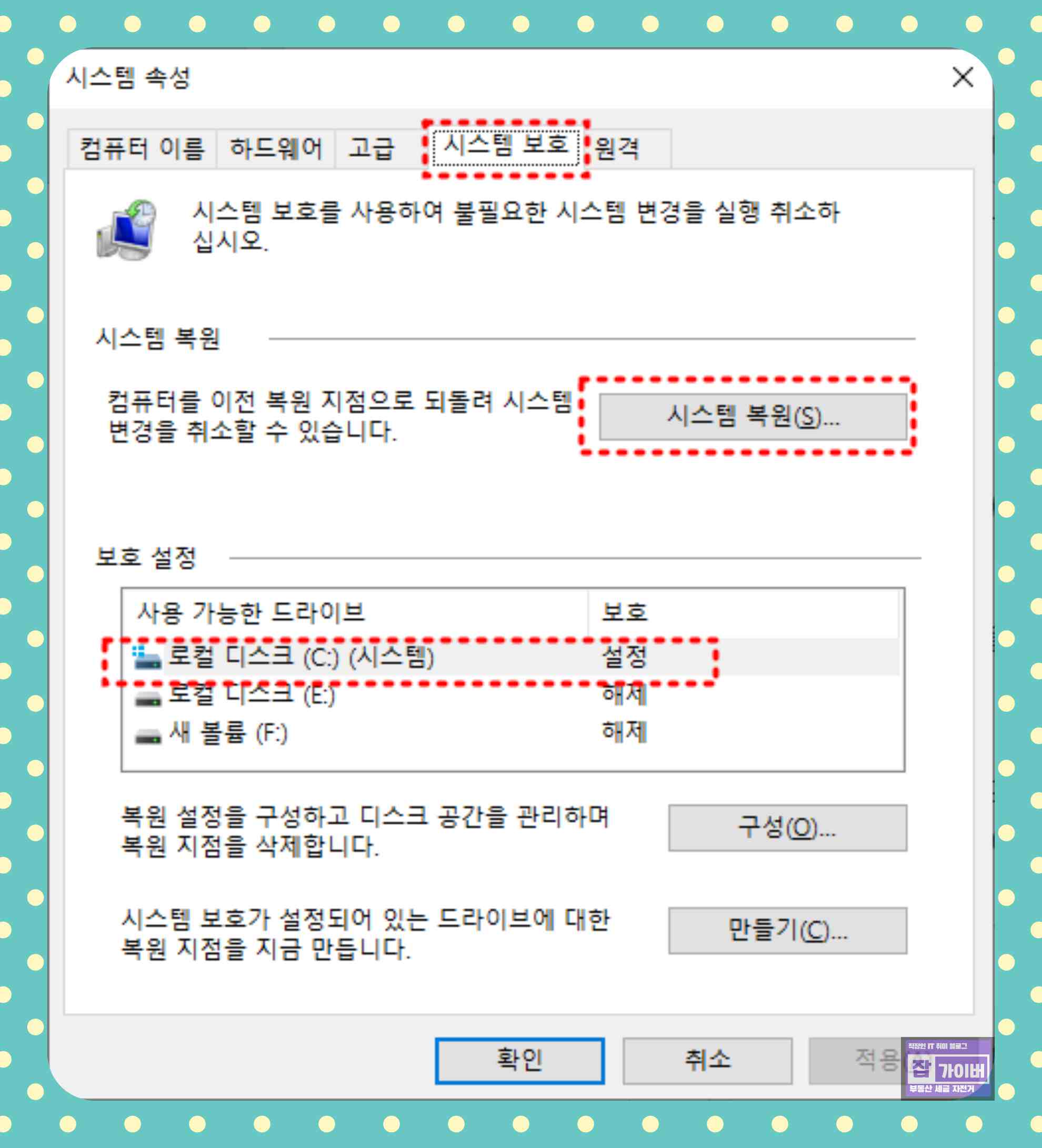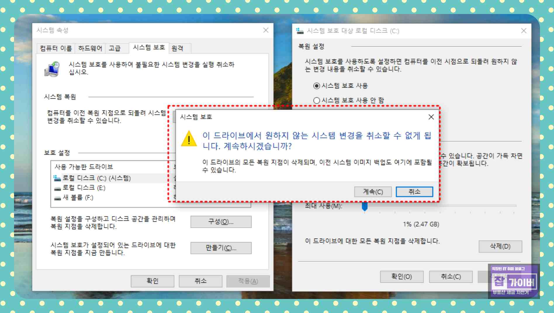 이러한 윈도우 자동백업 필요없다면 시스템 보호 사용안함으로 체크하고 드라이브의 모든 백업지점을 삭제합니다.