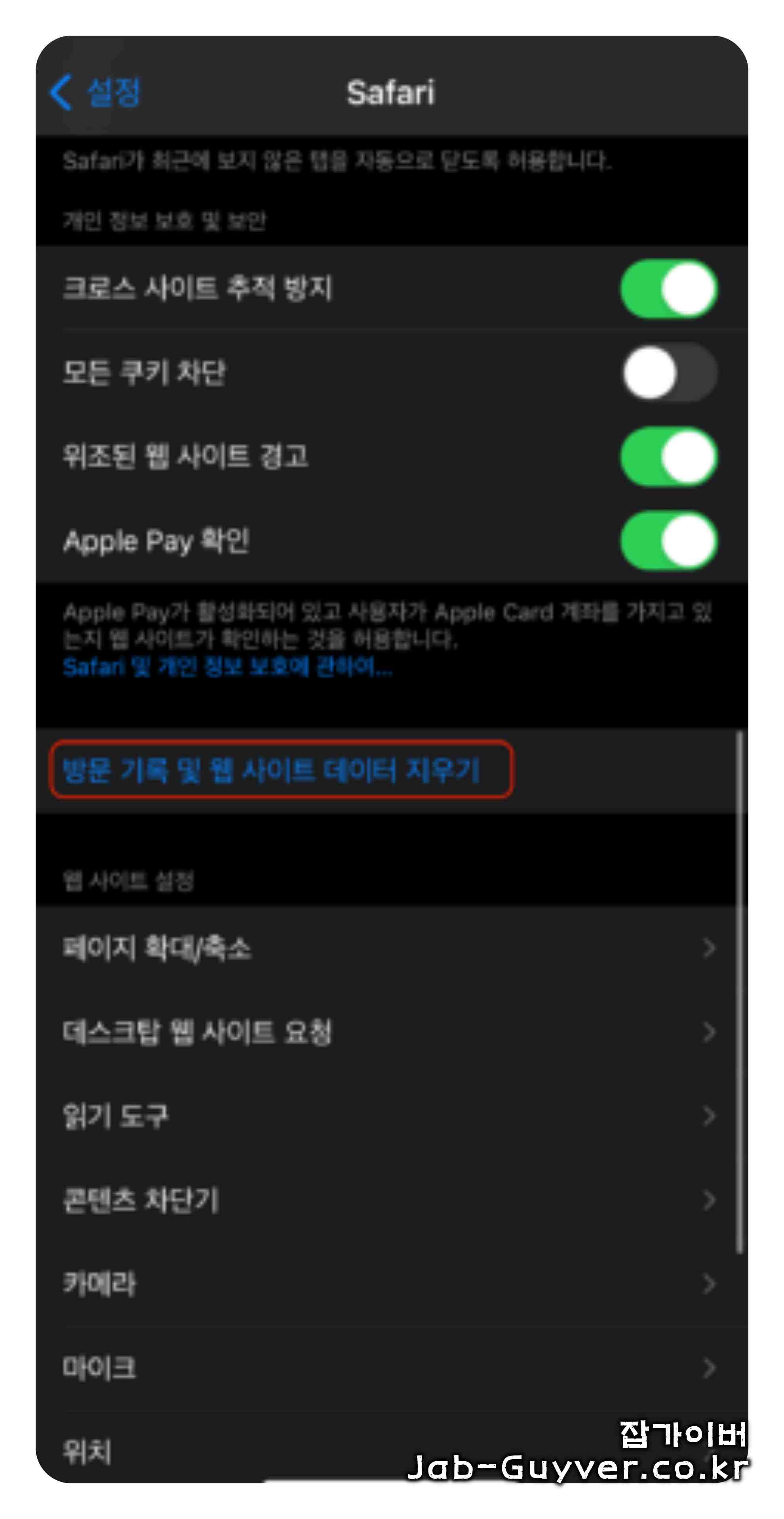 - 설정 > Safari > 방문기록 및 웹사이트 데이터 지우기