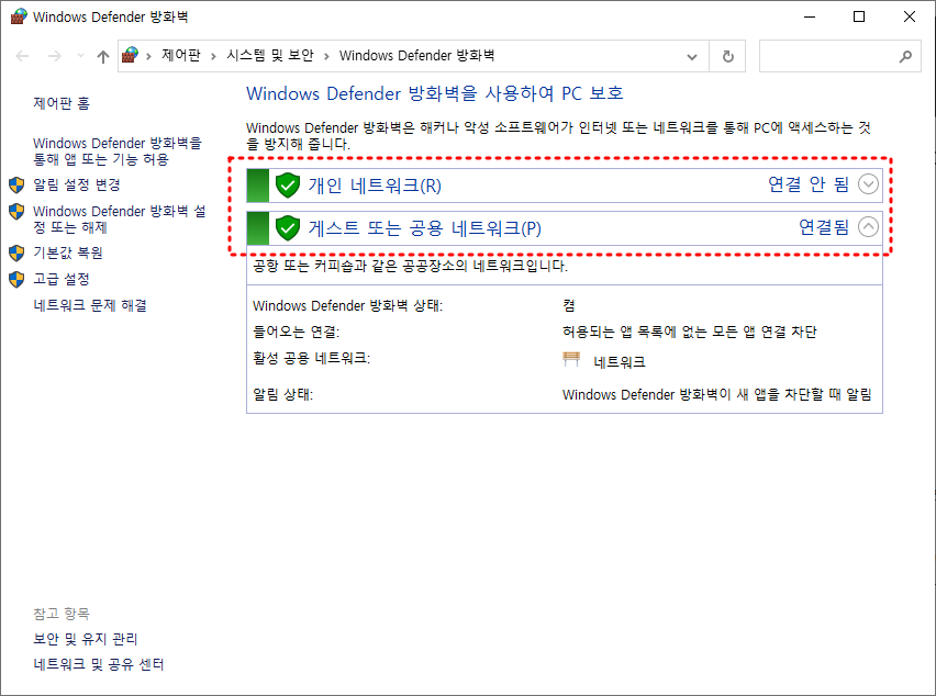 제어판에서 "Windows 방화벽 설정 또는 해제"로 이동하여 방화벽 설정을 비활성화해주세요.