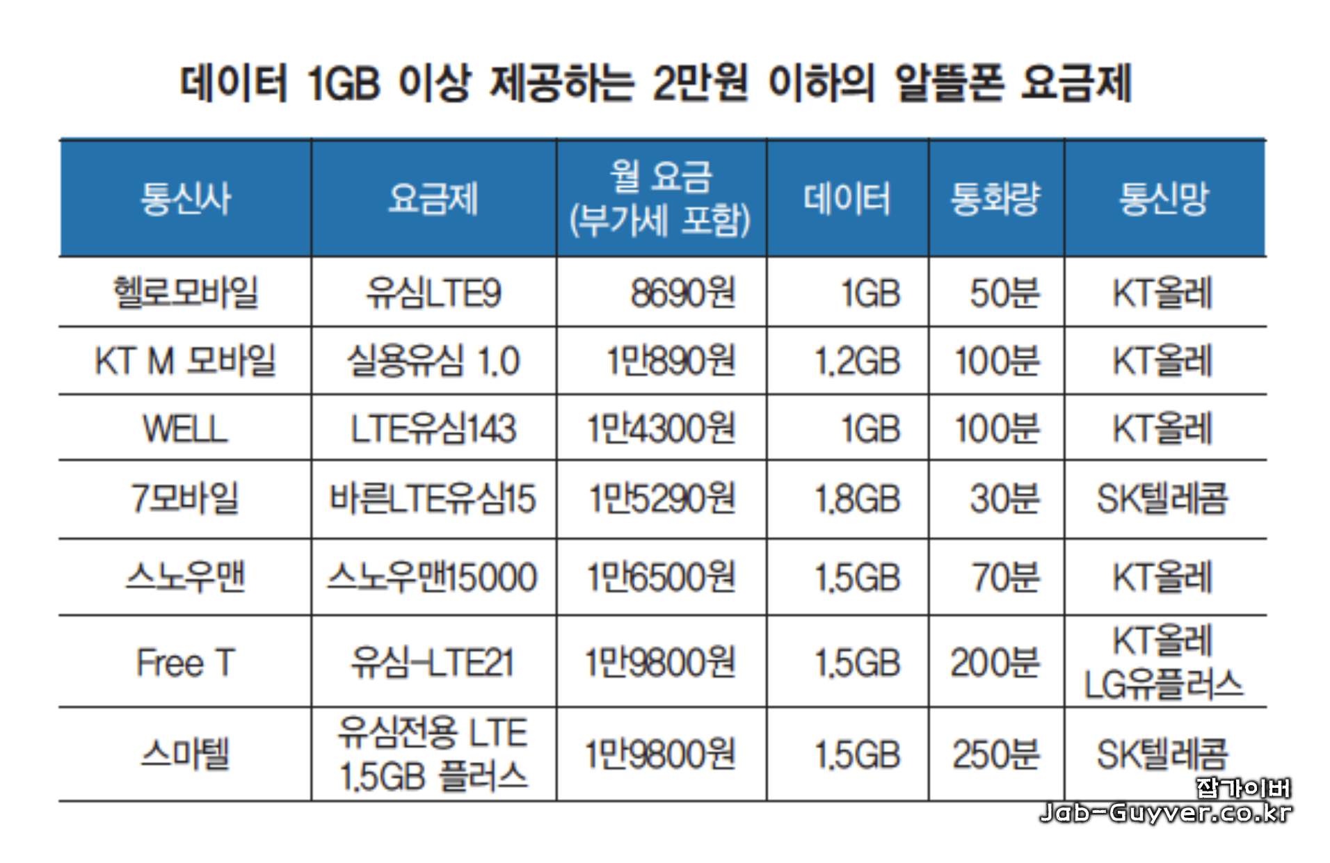 | 알뜰폰 통신사 | 알뜰폰 요금제 | 요금가격 |