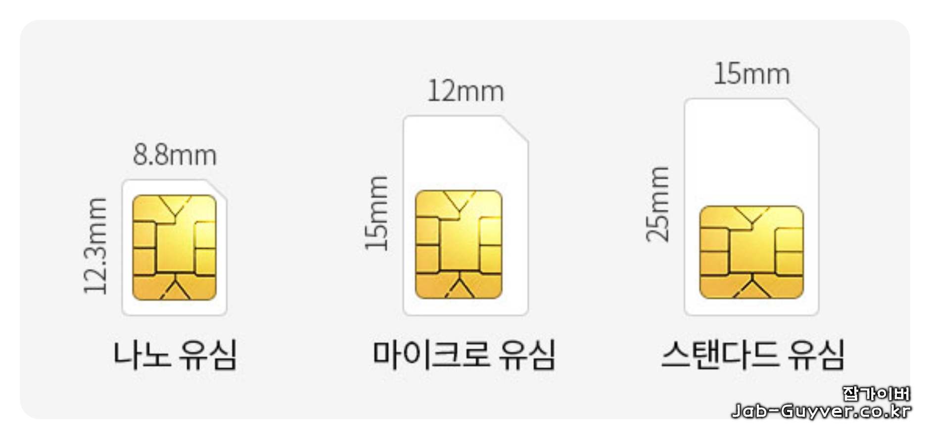 | 나노유심 | 12.3mm × 8.8mm | 아이폰5 이상, 갤럭시S6 이상, LG G6 이상 |
