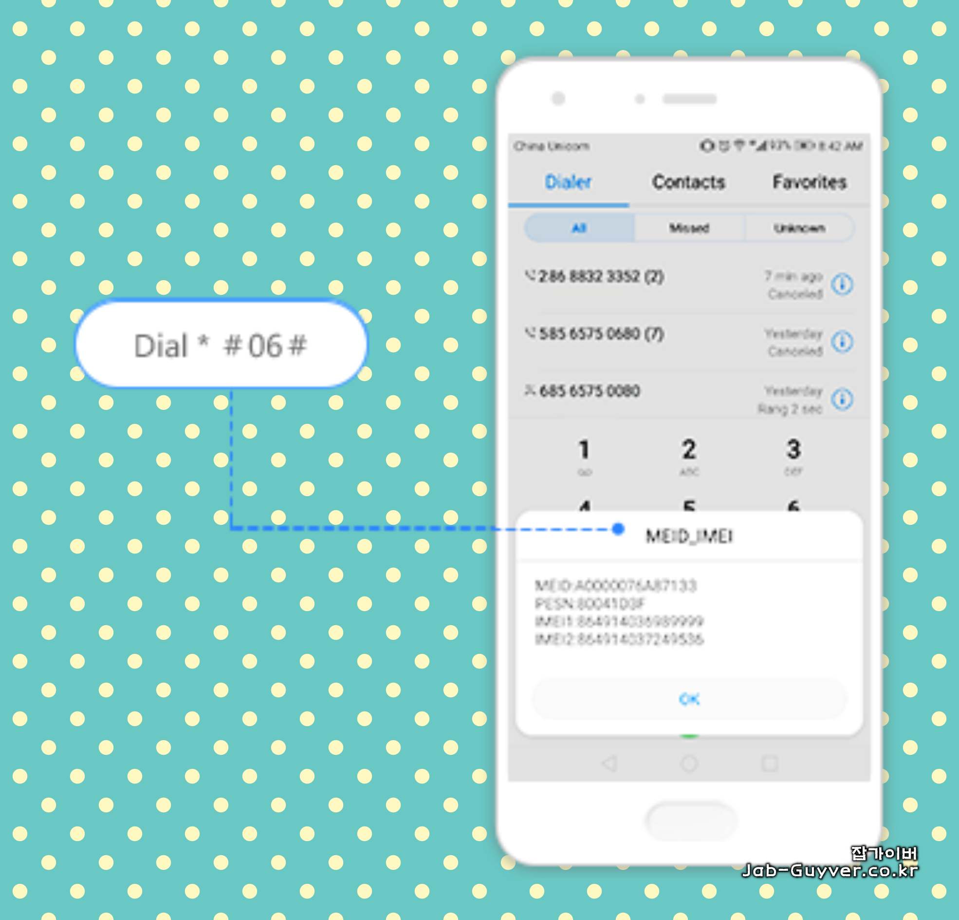 핸드폰 전화통화 앱을 통해 *#06#을 입력하여 IMEI 값을 확인하면 기기에는 문제가 있는지 분실폰 등 확인할 수 있습니다.