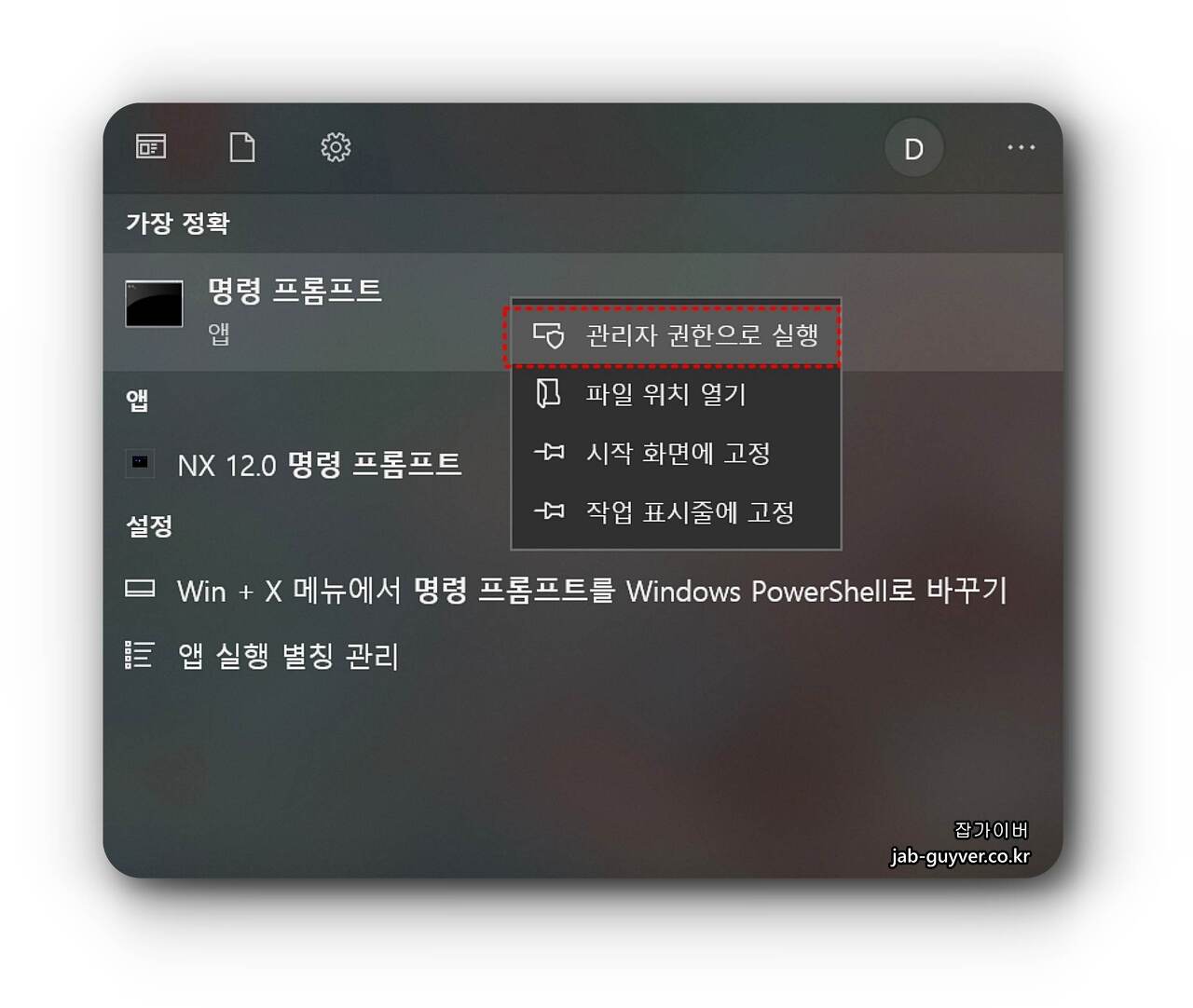 윈도우 검색 창에서 "cmd"를 검색하고 "명령 프롬프트"를 우클릭하여 관리자 권한으로 실행합니다.