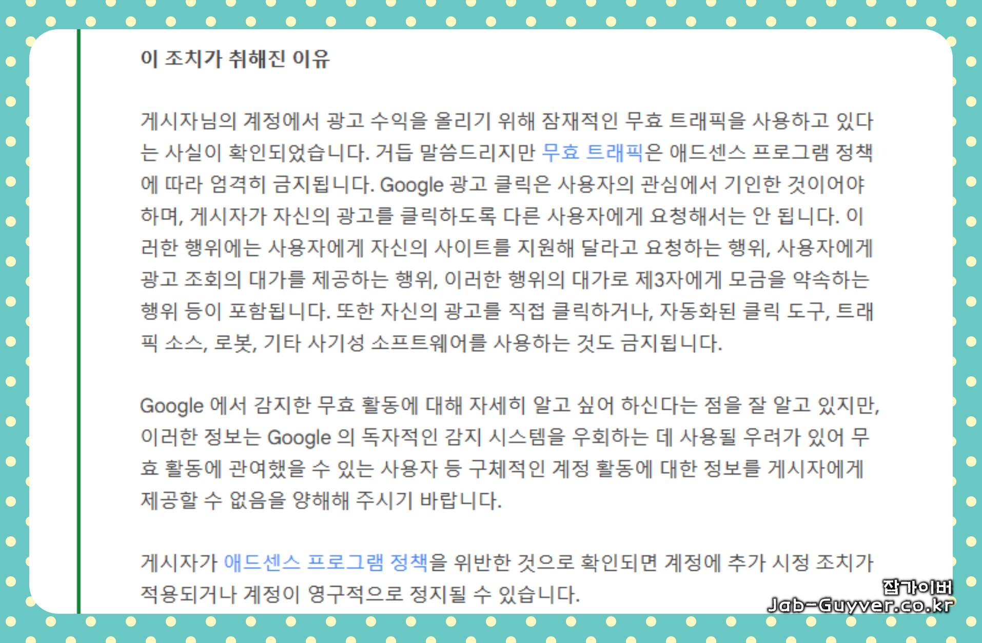 구글 애드센스 계정에서 갑자기 "게시자님의 구글 애드센스 계정에 일시적인 광고 게재 제한이 적용되었습니다." 알림이 뜨는 상황으로서 일시적인 광고 게재 제한이 적용된 상황에 대해 안내해 드리겠습니다. 이 글에서는 광고 트래픽 품질 리소스 센터, 무효 트래픽 정의, 그리고 무효 트래픽을 방지하기 위한 방법 등에 대해 소개하겠습니다. 부족한 내용은 추가하여 상세하게 작성해드리겠습니다.