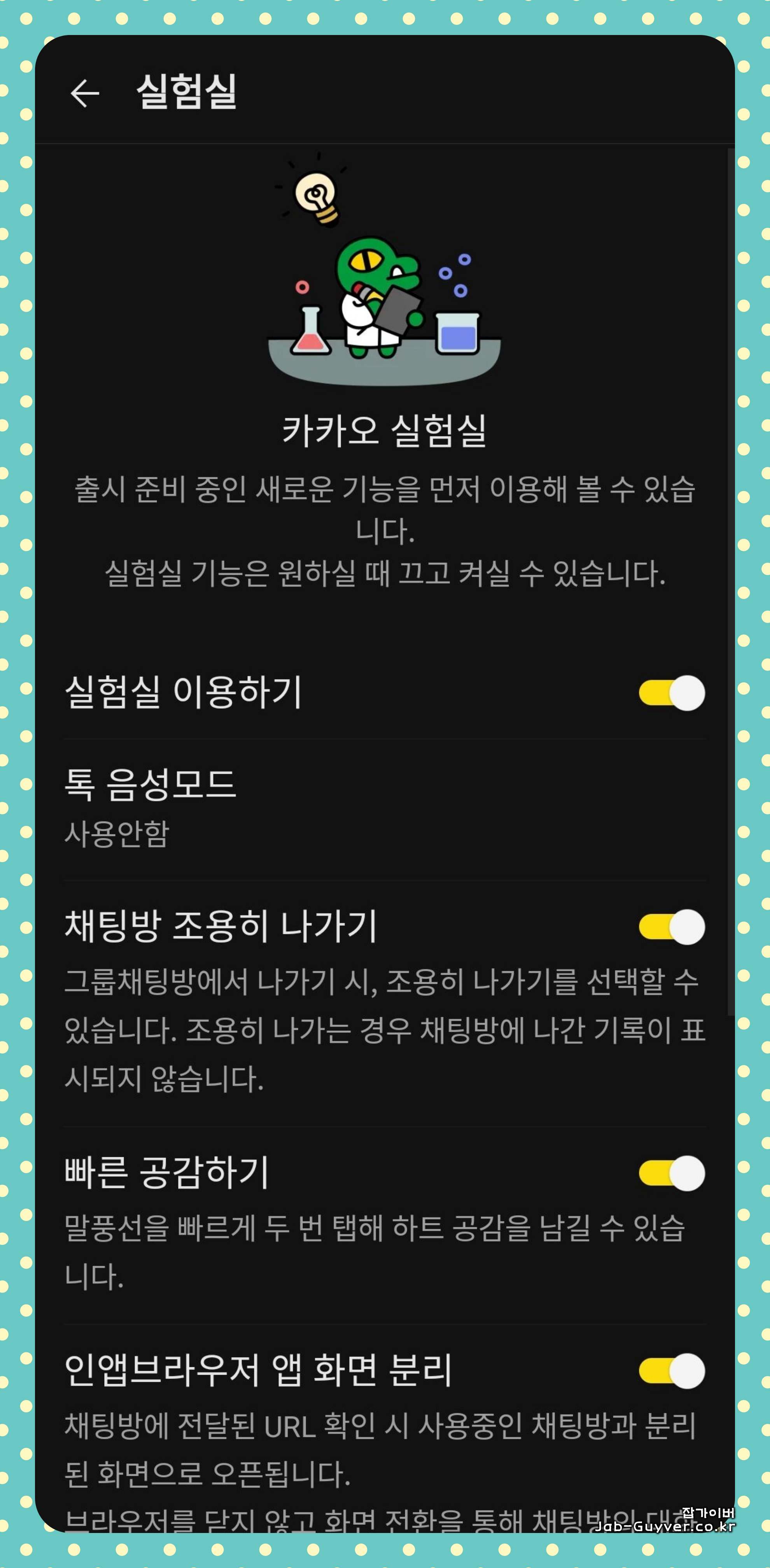 실험실은 카카오톡에 새로운 기능을 미리 테스트할 수 있는 옵션으로, 사용자의 반응을 실시간으로 확인하며 안정성을 점검하기 위해 제공됩니다.