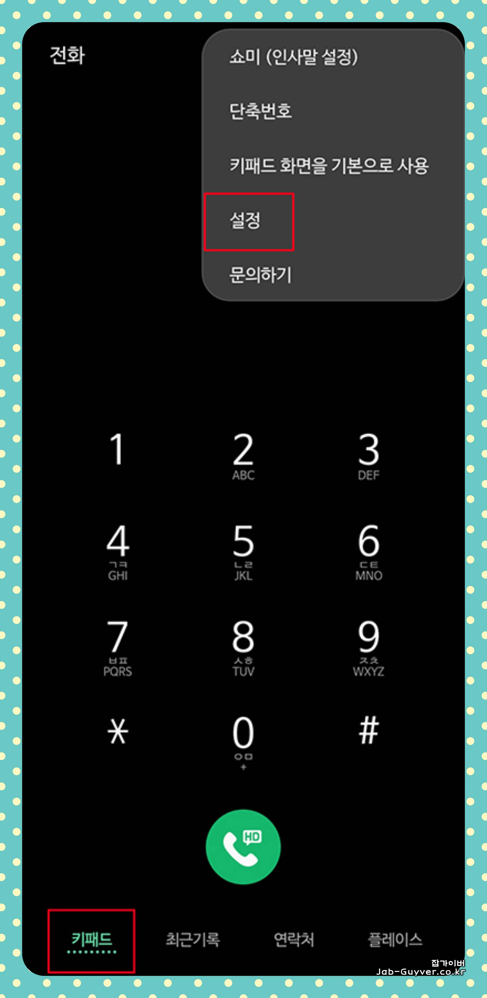 갤럭시의 기본 통화 앱을 실행한 후, 통화 화면에서 우측 하단에 위치한 ‘설정‘ - ‘통화 설정‘을 선택한 후, ‘추가 설정‘ 메뉴를 선택합니다.