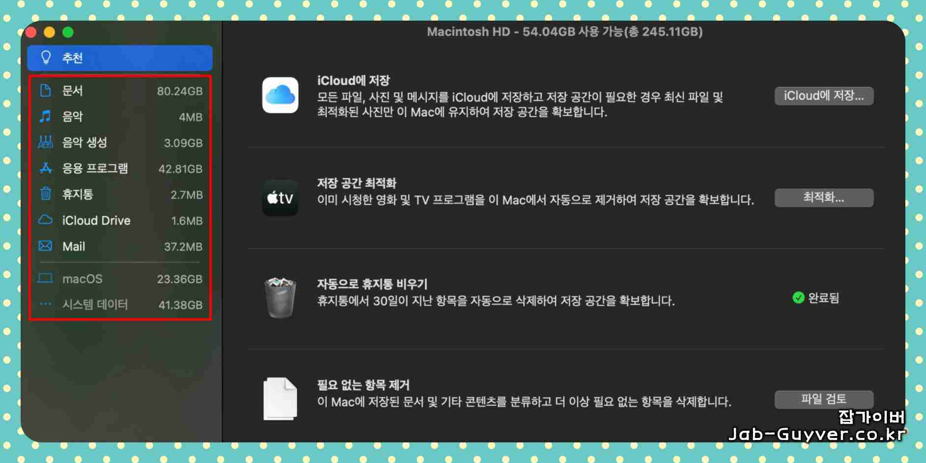| 대용량 파일 삭제 | 오래된 동영상, 백업 파일, dmg 이미지 등 삭제 | Finder → 파일 종류별 정렬 또는 '관리' 메뉴의 '파일 검토' 활용 |
