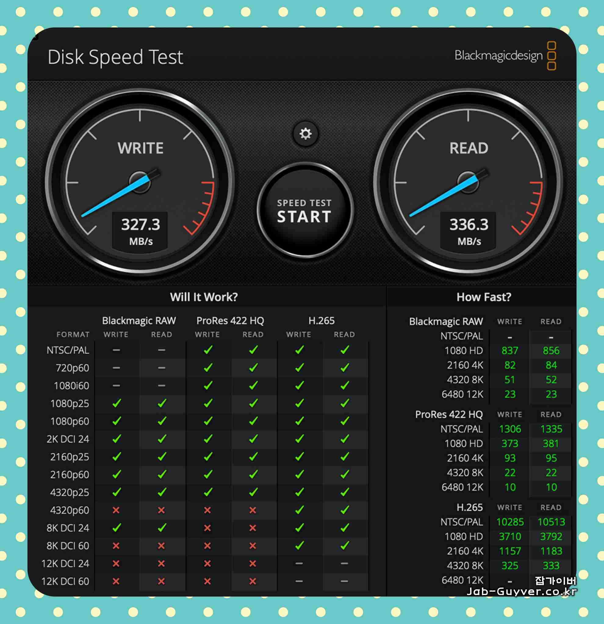 이와 같은 방법으로 Blackmagic Disk Speed Test를 사용하여 맥북의 HDD, SSD, 외장하드의 속도를 간단하게 측정할 수 있습니다. 디스크 속도측정 결과는 개별 디스크의 성능에 따라 다를 수 있으며, 실제 작업 환경에서의 성능과도 차이가 있을 수 있으며 디스크속도 측정결과를 해석할 때는 자신이 사용하는 디스크의 성능과 비교하고 실제 작업 환경에서의 성능을 고려해야 합니다.