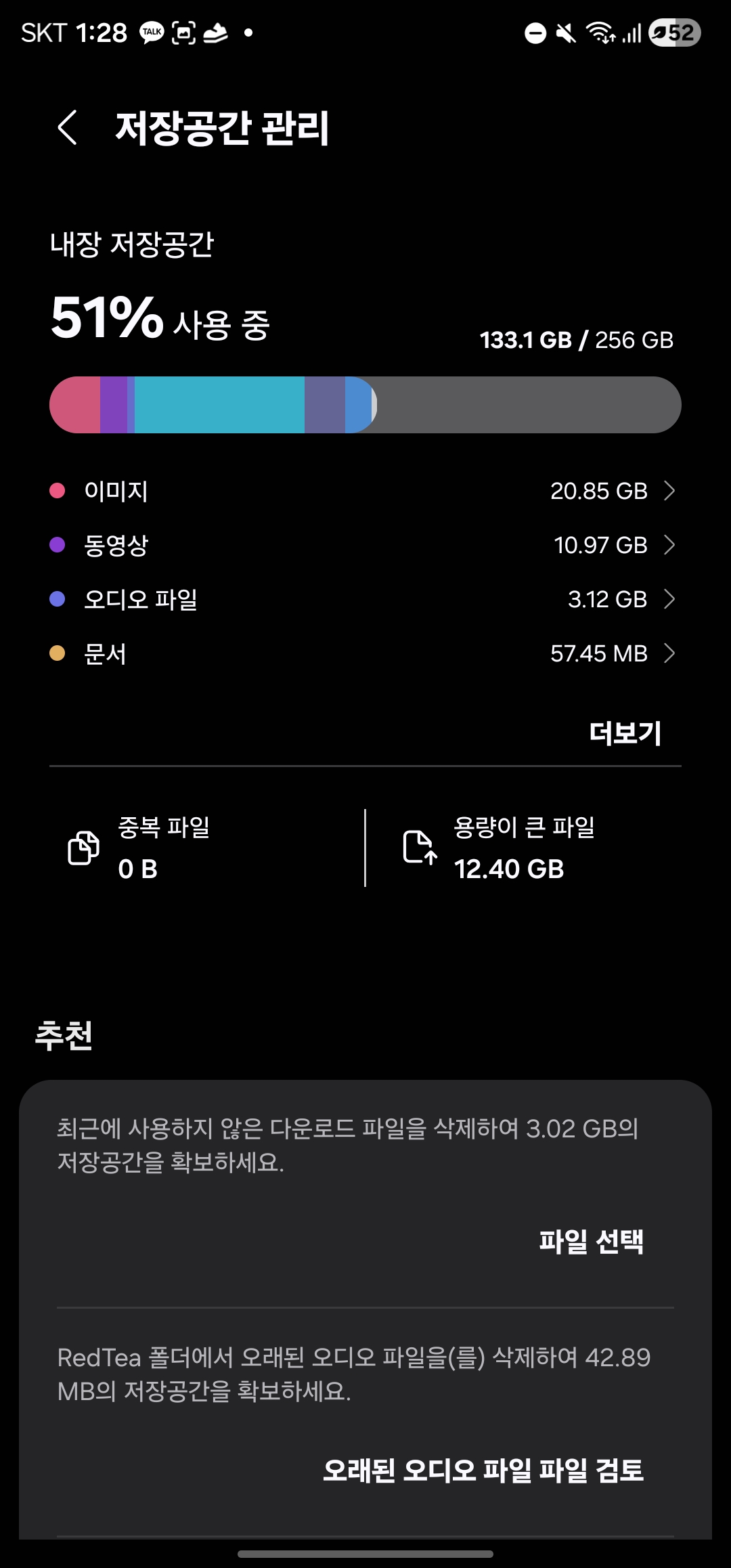 디바이스 케어 화면에서 저장용량 막대가 붉은색에 가까워져 있다면 이미 갤럭시 저장공간 부족 상태라는 뜻이라 앱 설치나 업데이트가 제대로 안 될 수 있고, 메모리가 부족하면 앱 전환 시 끊김이 심해질 수 있습니다. 이때부터는 한 번은 제대로 정리해 줄 필요가 있습니다.
