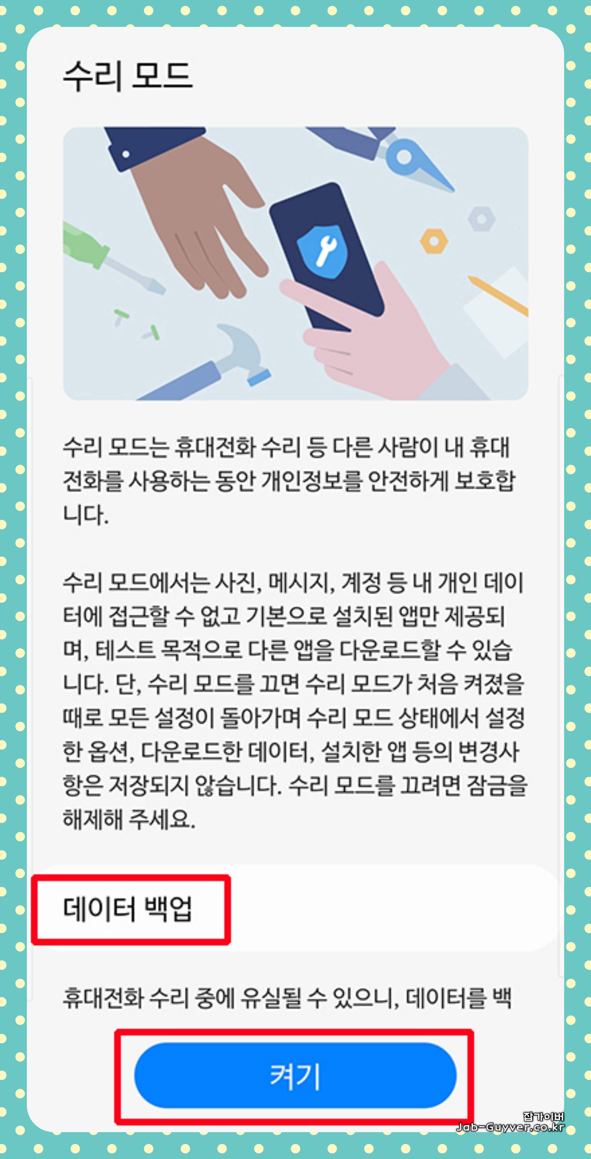 갤럭시 핸드폰 AS에서 개인정보 보호를 위한 수리모드 설정을 정리해 보겠습니다.