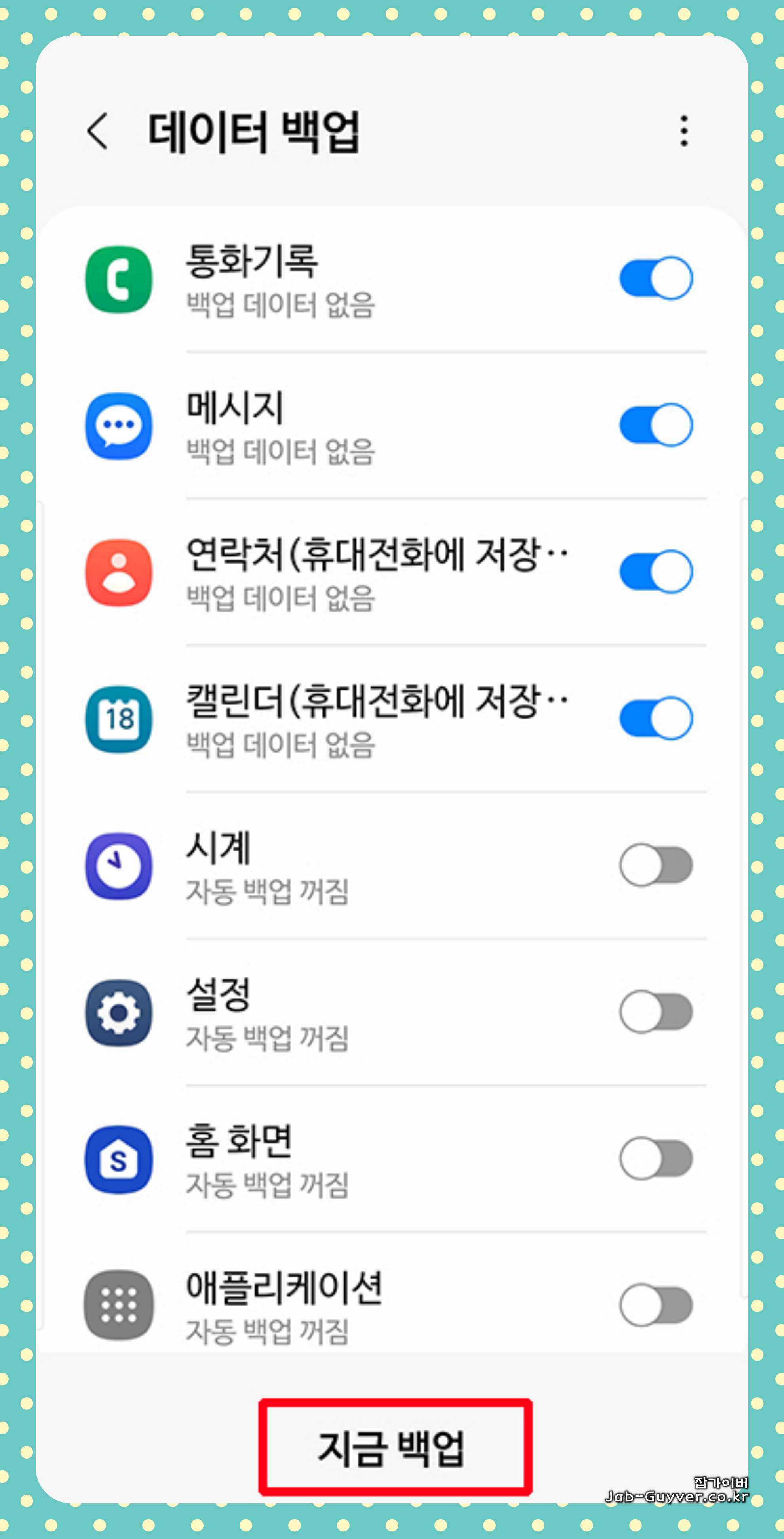 핸드폰 설정에서 계정 및 백업을 통해 스마트스위치 등을 통해 백업이 가능합니다.