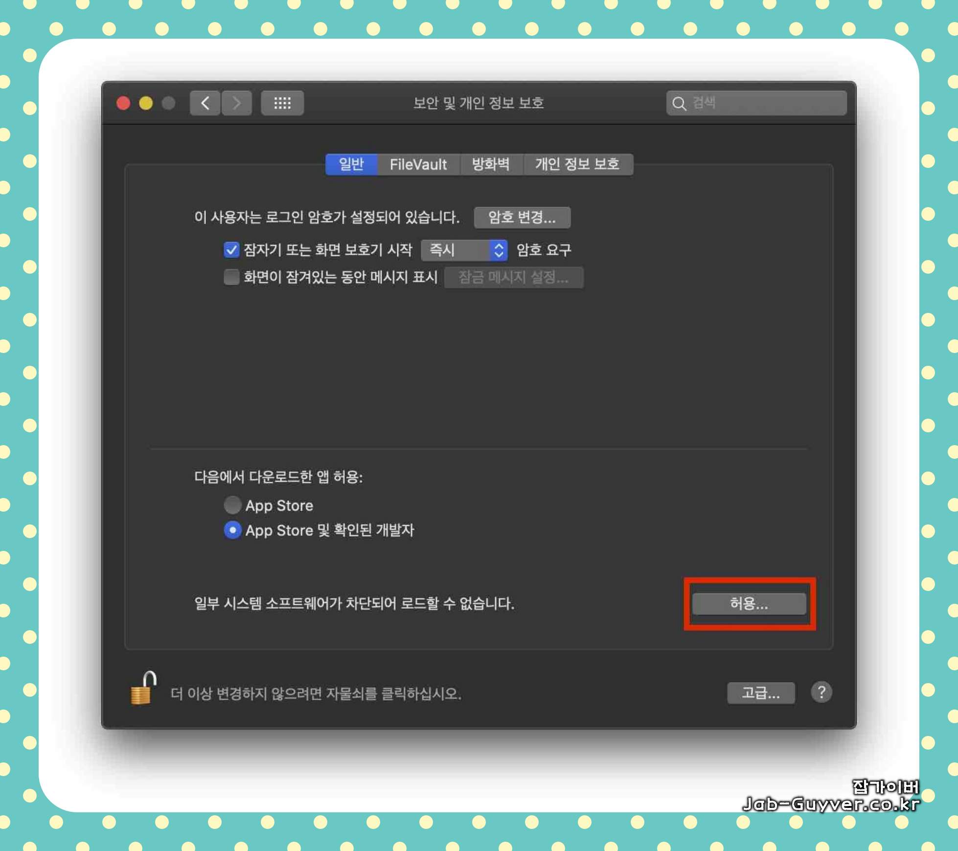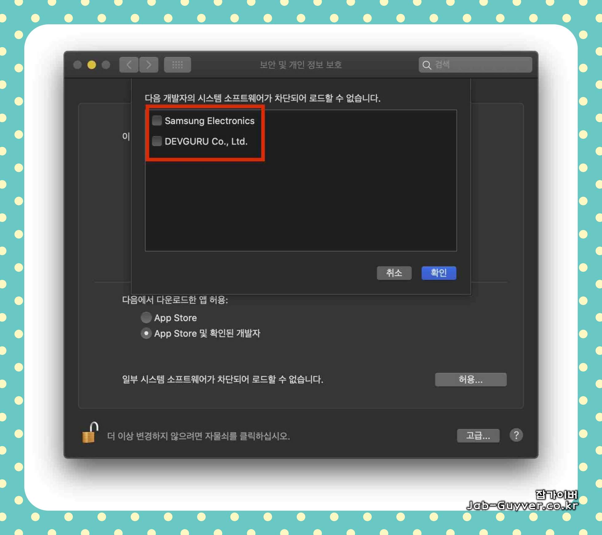 자물쇠 아이콘을 클릭하여 수정 권한을 얻은 다음 "허용" 버튼을 클릭하여 "Samsung Electronics" 및 "DEVGURU Co., Ltd."를 선택한 후 확인을 눌러줍니다.