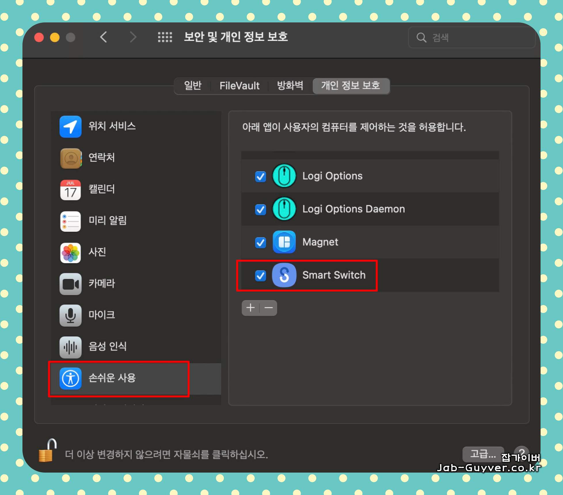 스마트스위치를 실행하면 "손쉬운 사용 접근 권한" 팝업창이 표시됩니다.