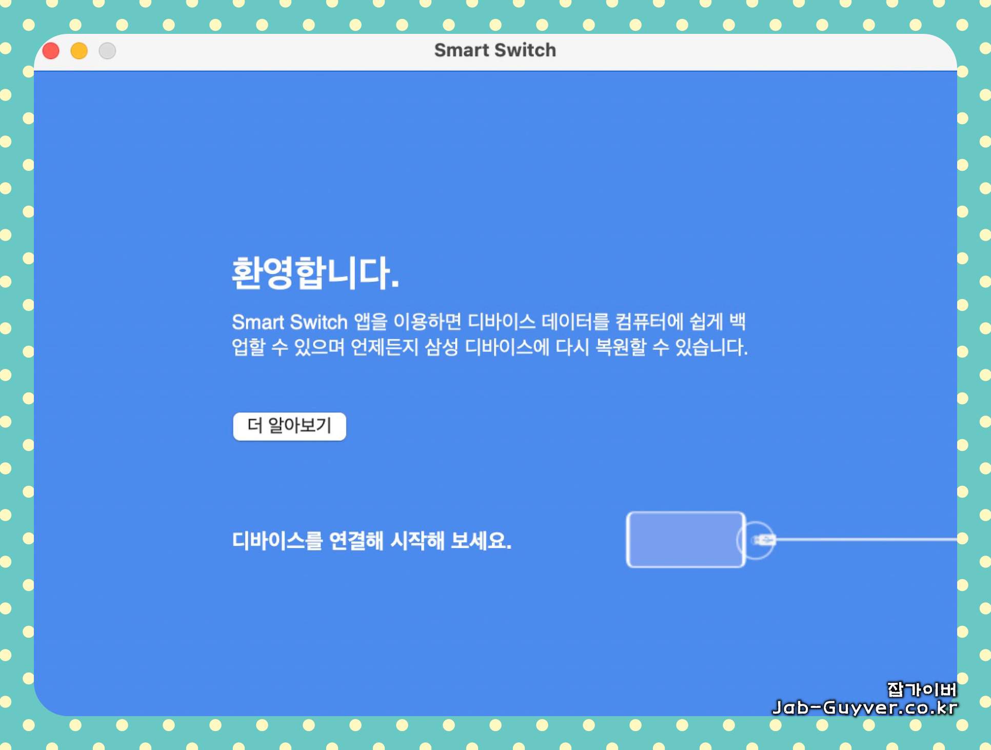권한 설정이 완료되면 스마트스위치를 실행한 후 갤럭시 핸드폰을 USB로 맥에 연결합니다.