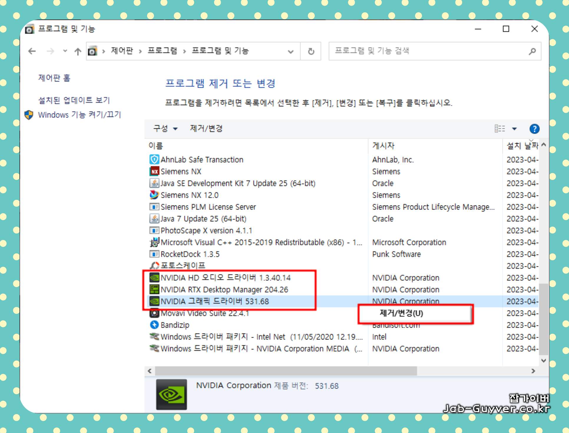 - 드라이버 설치 파일을 미리 다운로드 (삭제 후 네트워크가 꼬이면 바로 설치가 막힐 수 있음)