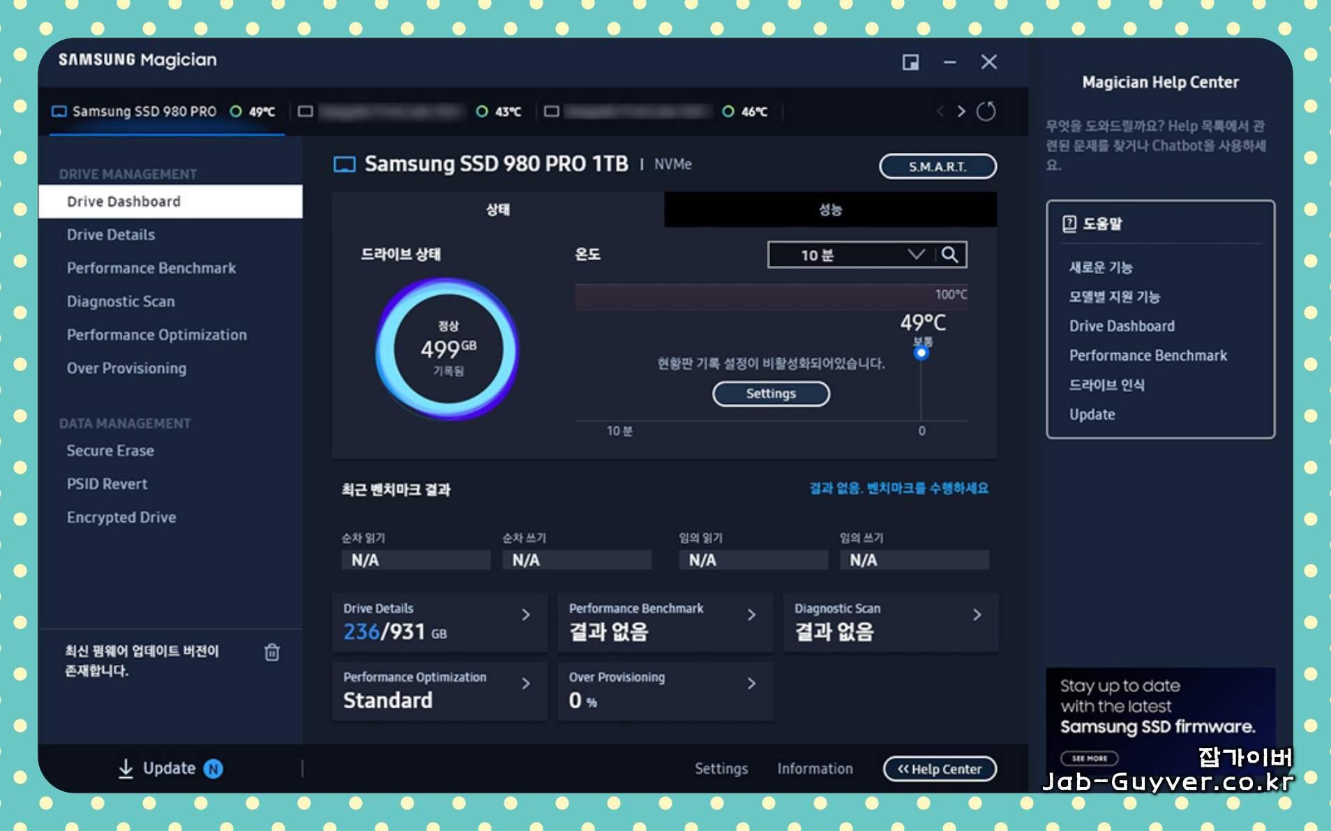 소프트웨어를 실행하면 왼쪽 아래에 최신 펌웨어 업데이트 버전이 표시되며 현재 사용중인 삼성 SSD 모델 및 펌웨어 업데이트, 최적화 및 보안 수명, 성능등을 확인할 수 있으며 삼성매지션 호환가능한 삼성SSD 목록은 아래 참고하세요