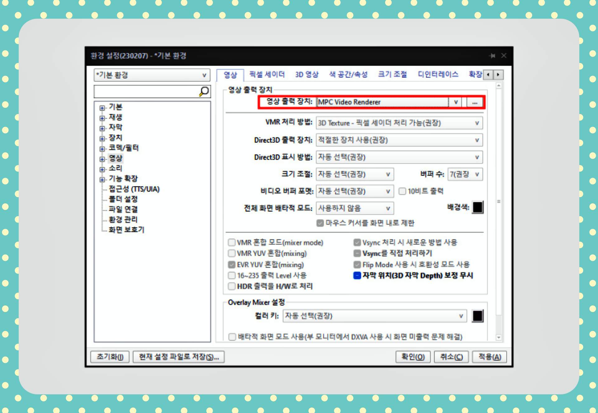 환경 설정의 영상 탭으로 이동한 후, 영상 출력 장치를 "MPC Video Renderer"로 변경하면 설정이 완료됩니다.