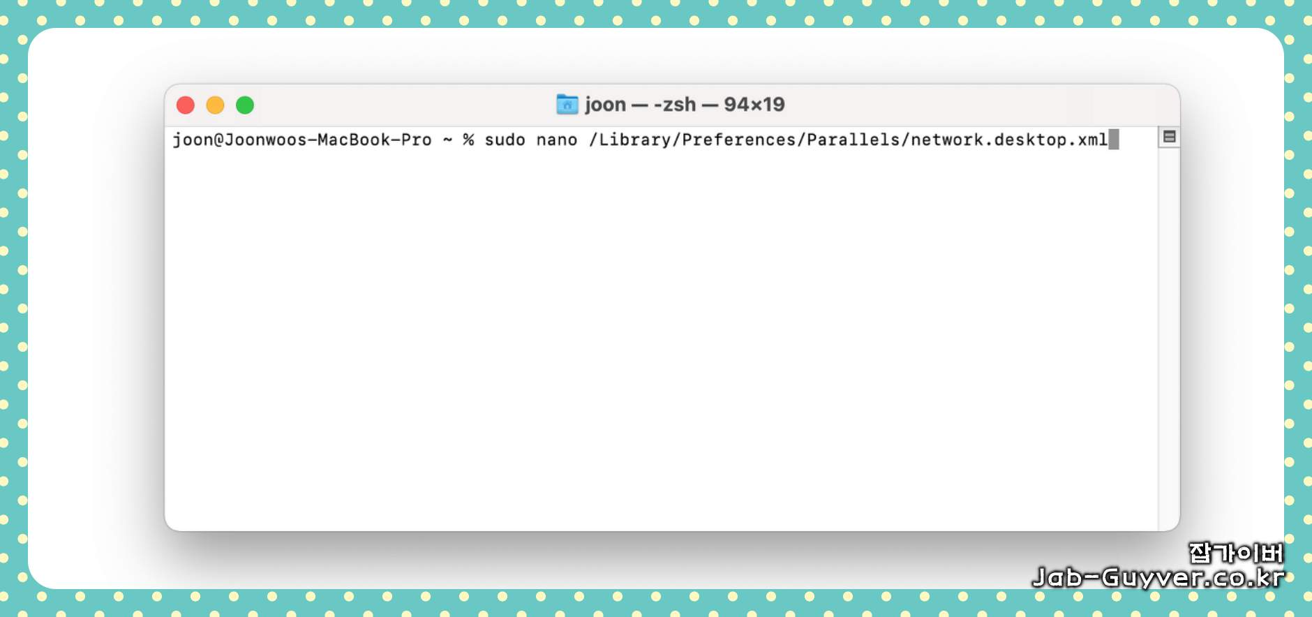 우선 패러럴즈를 완전히 종료해 둔 상태에서 맥의 터미널을 실행합니다. 런치패드에서 "기타" 폴더 안의 터미널을 열거나, 스포트라이트 검색으로 바로 띄워도 됩니다. 그런 다음 아래 명령어를 입력해 네트워크 설정 파일을 불러옵니다.