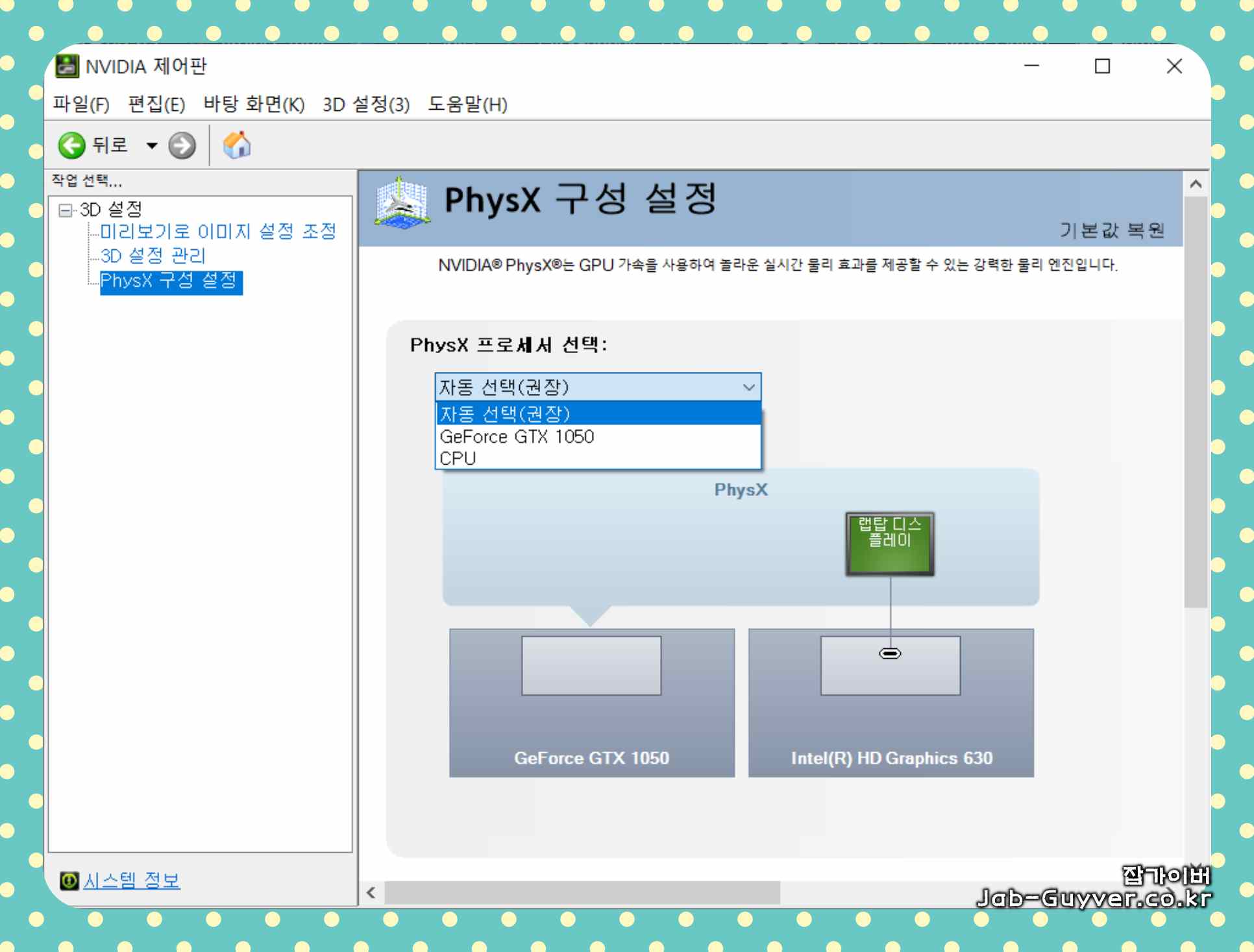 "PhysX 프로세서 선택"에서 외장 그래픽카드를 선택하면 됩니다.