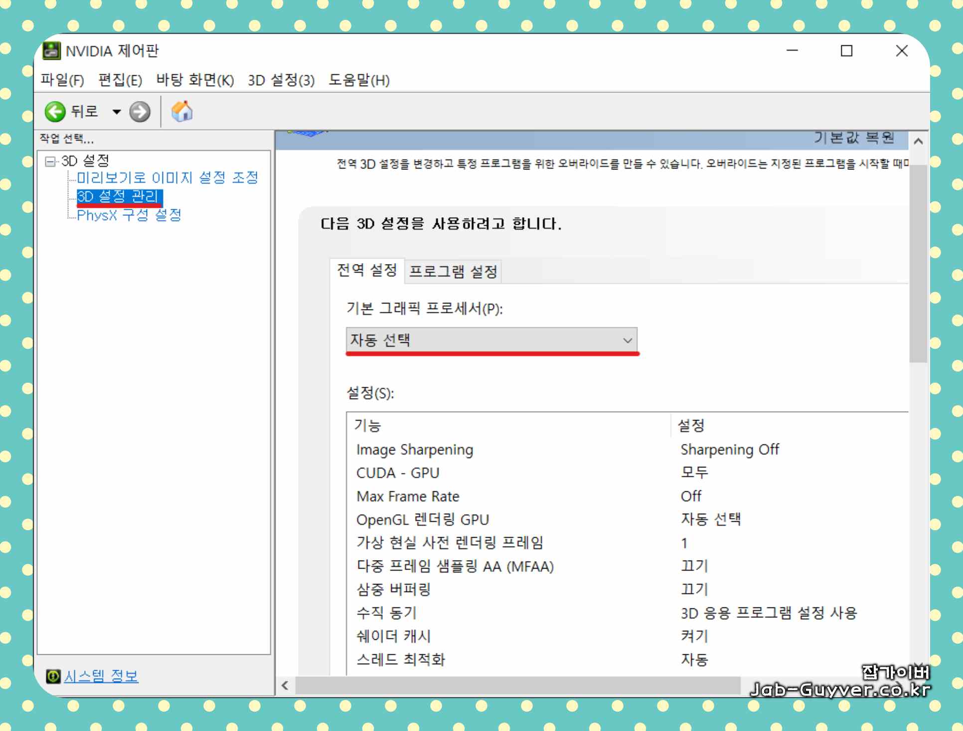 Nvidia 제어판에서 "3D 설정 관리"에 들어가면 "전역 설정" 탭으로 이동합니다.