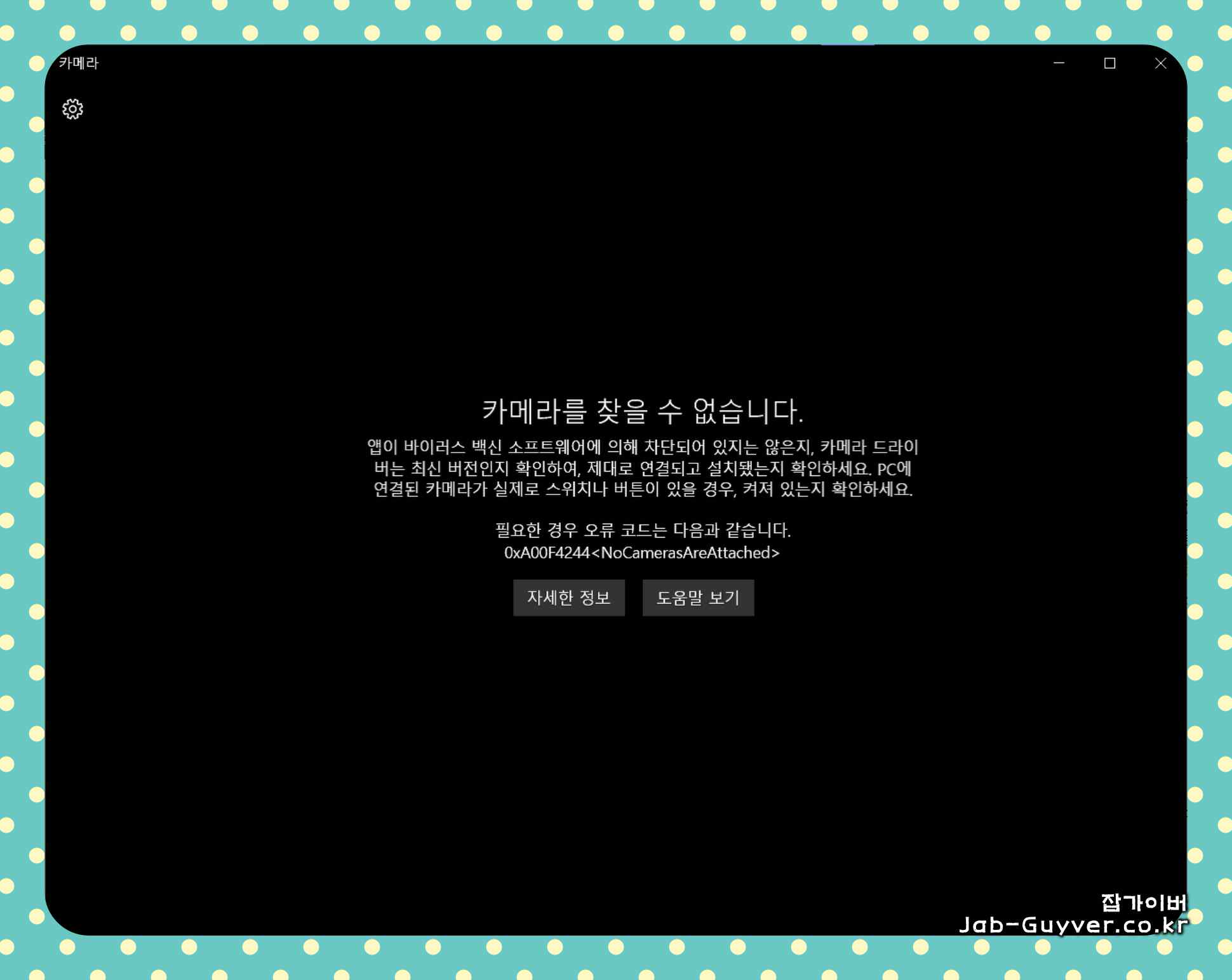 만약 보안 모드를 끈 후에도 "카메라를 찾을 수 없습니다." 메시지가 계속되면, 백신 소프트웨어에 의해 차단된 것인지 확인하고(일시적으로 백신 프로그램을 비활성화한 후 카메라 앱을 실행해 볼 수 있습니다), 카메라 드라이버가 최신 버전인지 확인해야 합니다.