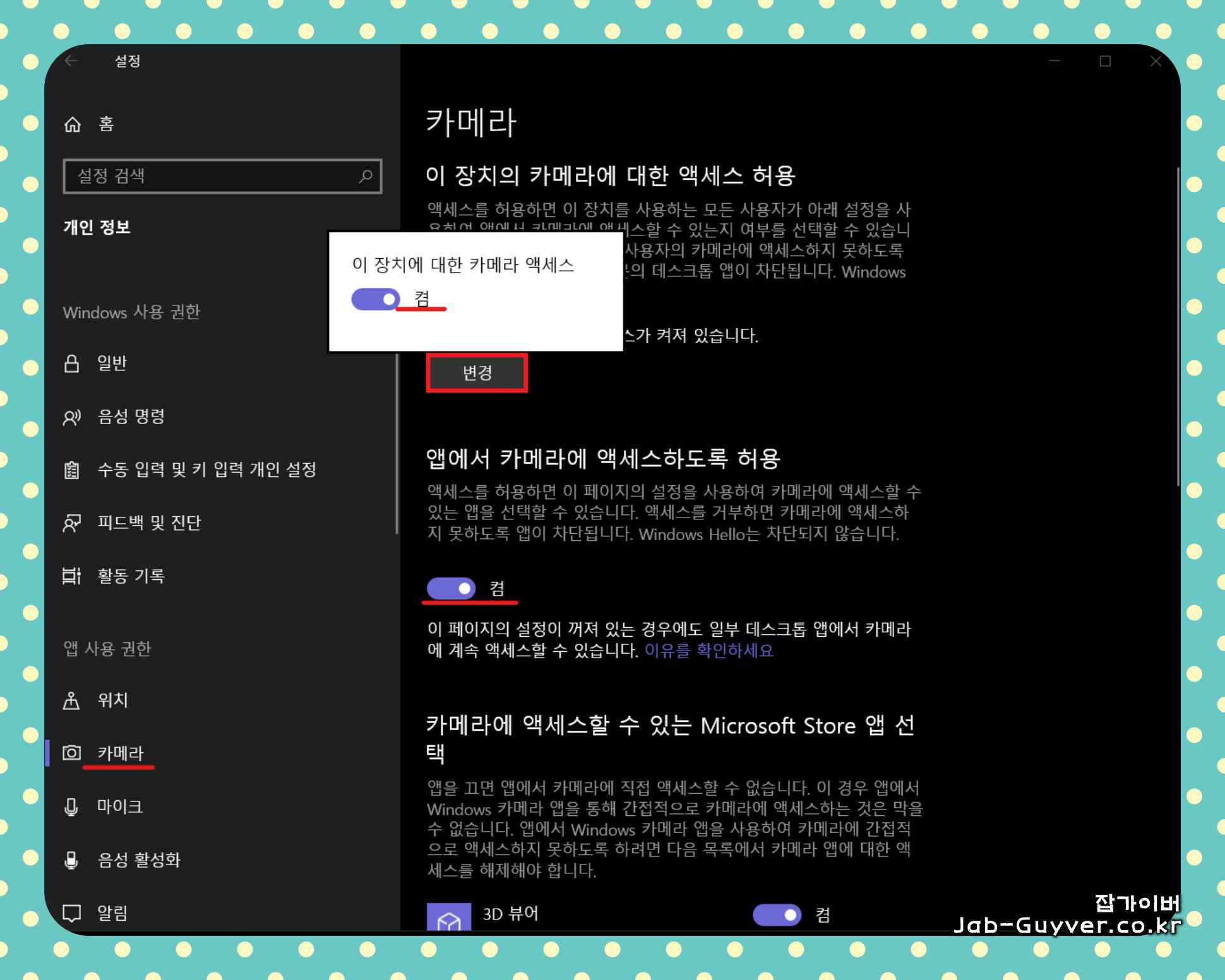 이 경우, '윈도우+x' 키를 누른 후 '설정'을 선택하고 '개인 정보'로 이동한 다음 '카메라' 탭에서 해당 장치의 카메라 액세스 허용을 변경하고 켜기로 설정하면 아래쪽의 다른 옵션들도 모두 활성화로 변경합니다.