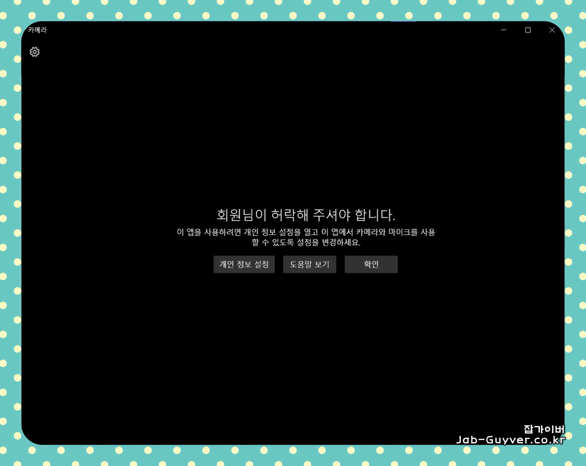 또 다른 가능한 해결 방법은 윈도우 설정에서 카메라 앱에 대한 액세스가 제한되어 있는 경우입니다. 이 경우, 카메라 앱을 실행하면 "회원님이 허락해 주셔야 합니다. 이 앱을 사용하려면 개인 정보 설정을 열고 이 앱에서 카메라와 마이크를 사용할 수 있도록 설정을 변경하세요."라는 메시지가 표시됩니다.
