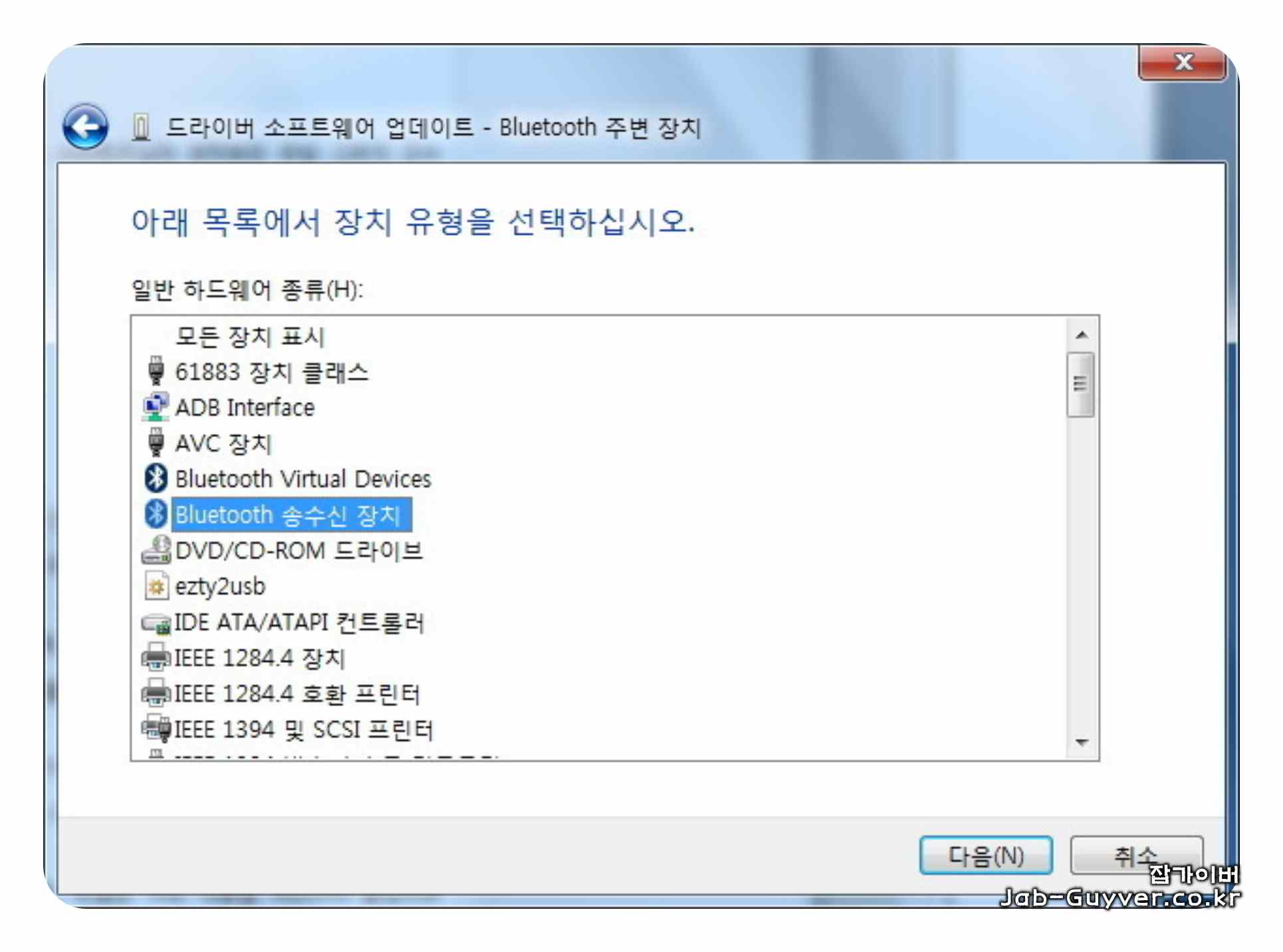 “Bluetooth 송수신 장치“를 선택하고 “다음” 버튼을 클릭 후 좌측에서 “Microsoft”를 선택합니다. 오른쪽 창에서 “Bluetooth MTP 장치 열거자“를 선택하고 “다음” 버튼을 클릭합니다.