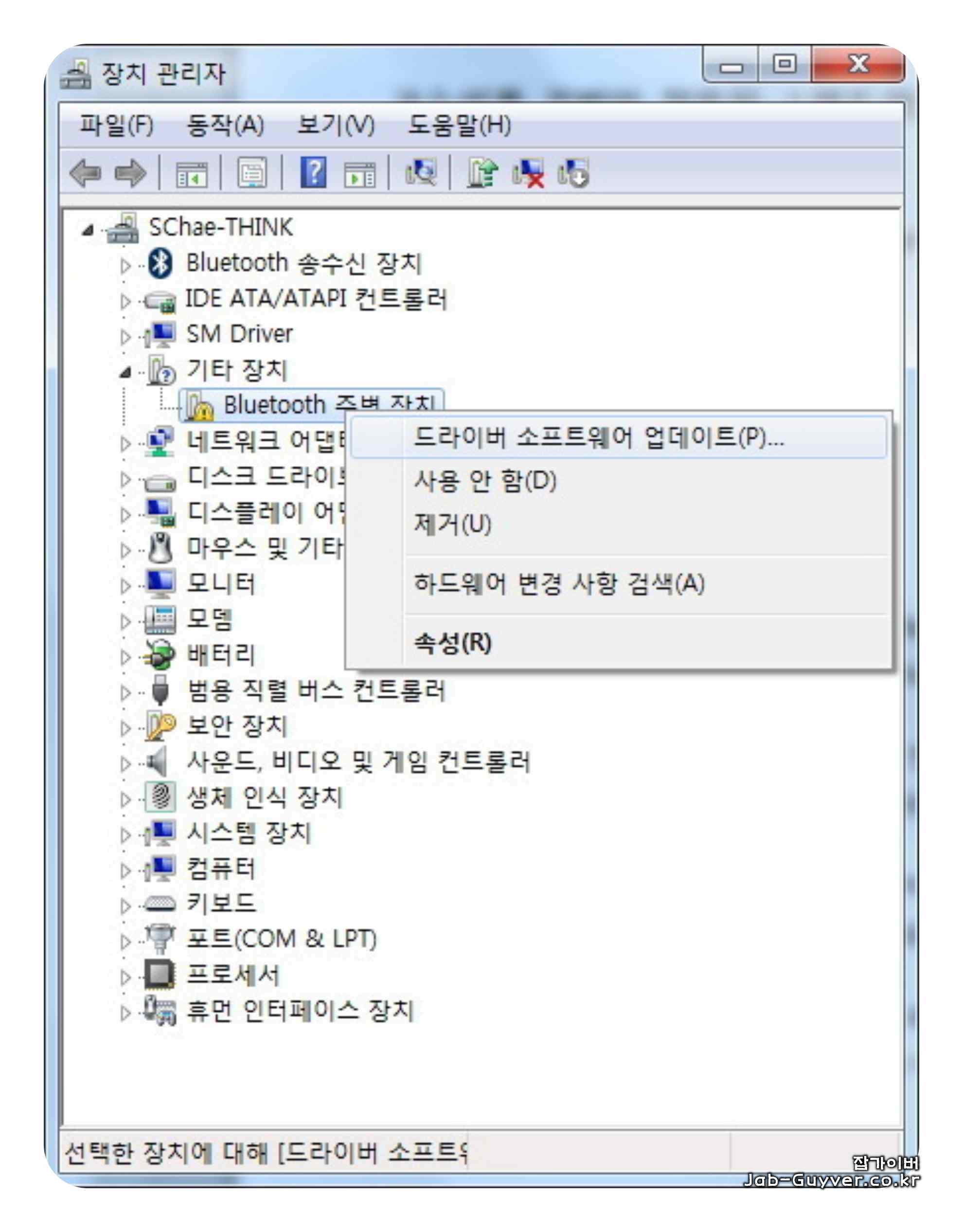 장치 관리자에서 “Bluetooth 주변장치” 항목을 찾아서 확인하며 해당 항목에는 느낌표가 표시되며 에러로 표시되며 “Bluetooth 주변장치” 항목을 마우스 오른쪽 버튼으로 클릭하고 “드라이버 소프트웨어 업데이트“를 선택합니다.