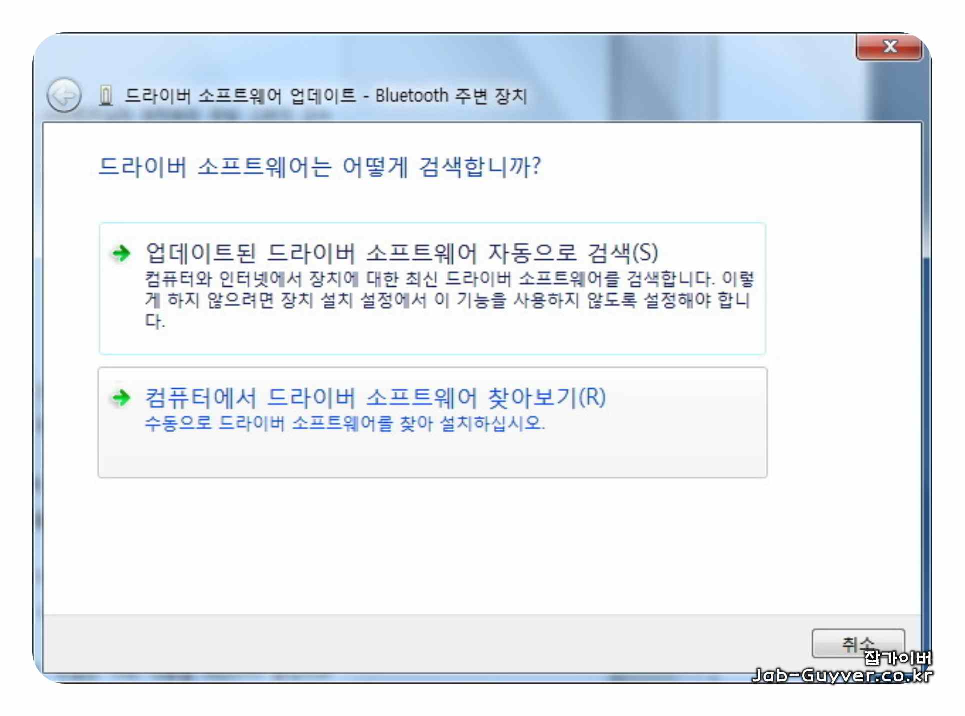 업데이트 창에서 “컴퓨터에서 드라이버 소프트웨어 찾아보기“를 선택 후 블루투스 주변 장치 드라이버 소프트웨어 업데이트 검색에서 “컴퓨터의 장치 드라이버 목록에서 직접 선택”을 선택합니다.