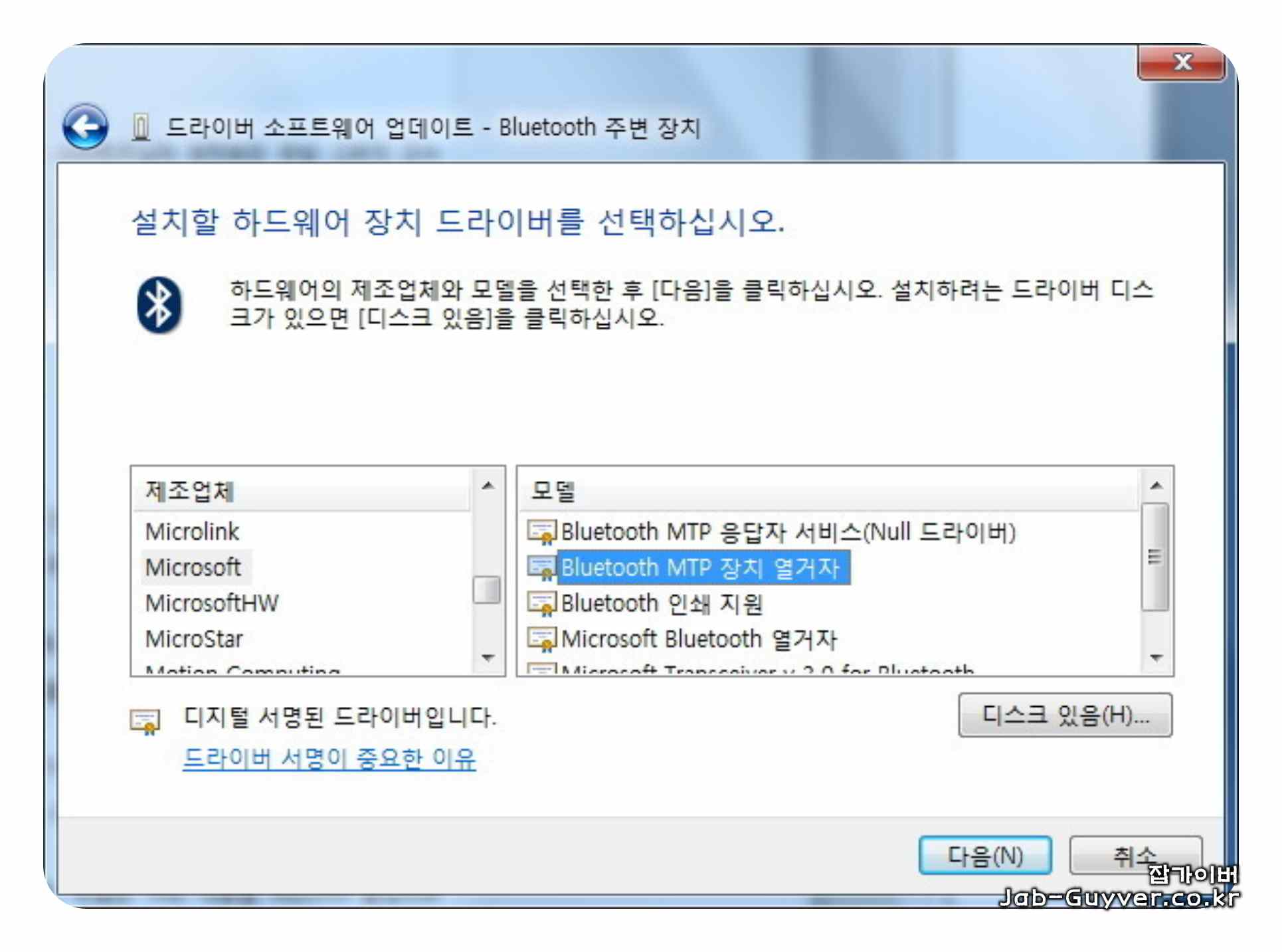 “Bluetooth 송수신 장치“를 선택하고 “다음” 버튼을 클릭 후 좌측에서 “Microsoft”를 선택합니다. 오른쪽 창에서 “Bluetooth MTP 장치 열거자“를 선택하고 “다음” 버튼을 클릭합니다.