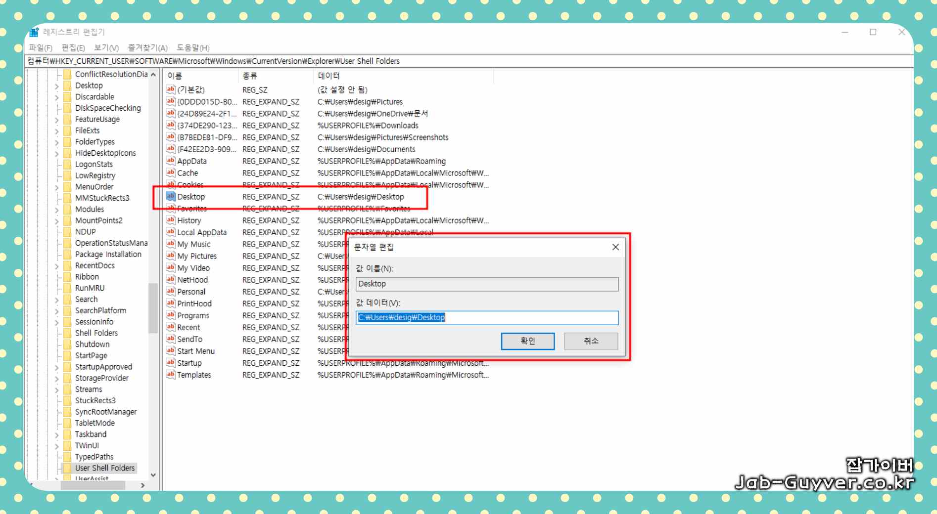 문제가 여전히 해결되지 않는다면 값데이터에 "C:\Users\사용자 계정명\Desktop"로 값을 변경하며 이때 사용자계정명은 직접 자신의 PC정보로 변경해서 입력합니다.