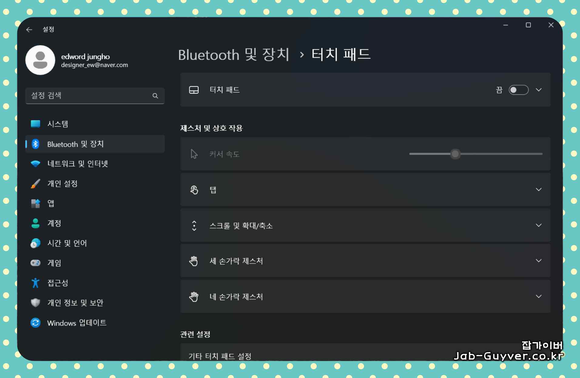 마우스 설정 창에서 '터치패드' 또는 '디바이스 설정' 탭에서 터치패드 옵션을 선택한 후, '끄기' 또는 '비활성화' 옵션을 찾아 체크하거나 설정을 변경합니다.