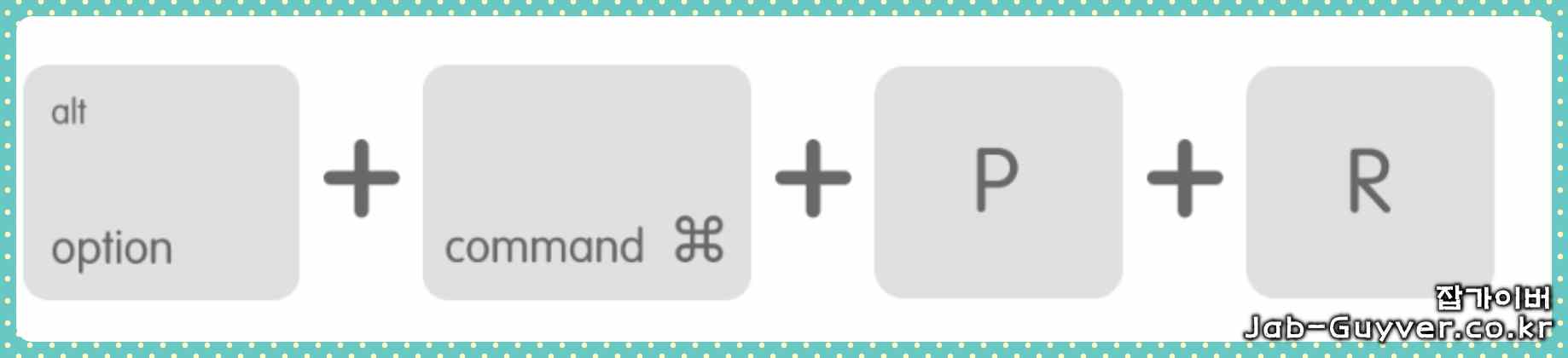 전원 버튼을 누르자 마자 바로 아래처럼 옵션 + 코멘드 + P + R 키를 눌러주면 부팅 시동음이 뗑~ 하고 들릴때까지 떼지 말고 있다가 한번 더 시동음이 땡~ 하고 들리면 키를 놓아주면 NVRAM/PRAM 재설정가 완료됩니다.