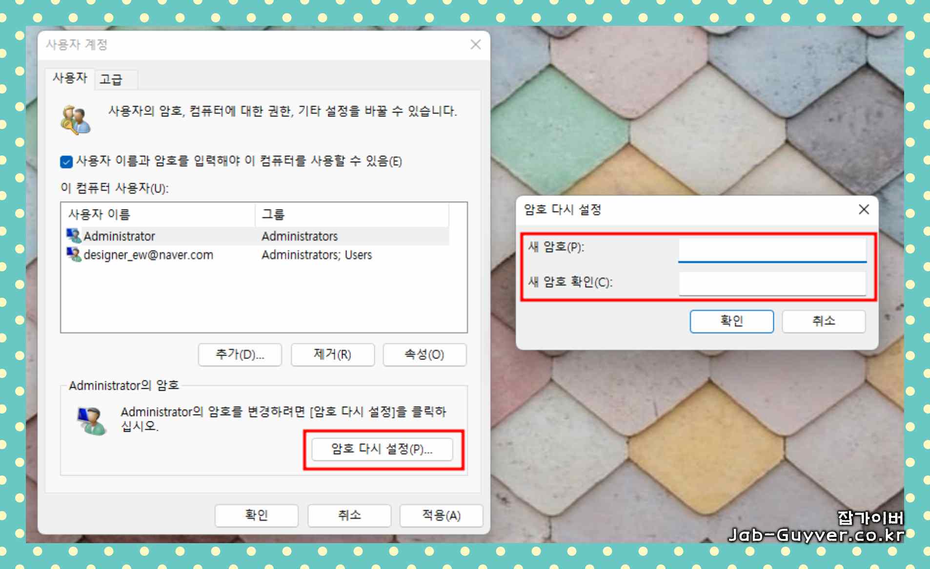 우선 윈도우 부팅 시 암호를 기억하고 있다면 정상 부팅 후  암호를 제거합니다.