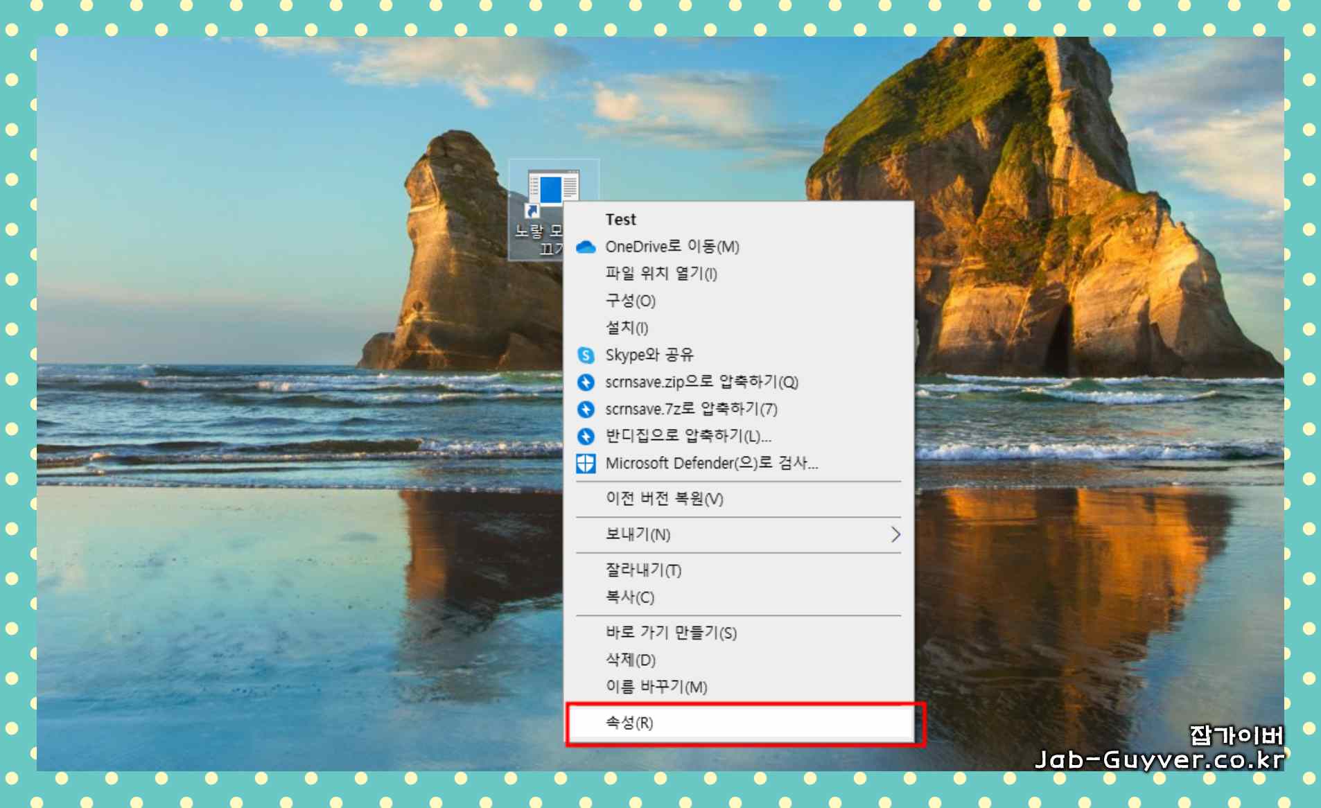 생성한 바로가기 파일을 마우스 우클릭하고 "속성"을 선택합니다.