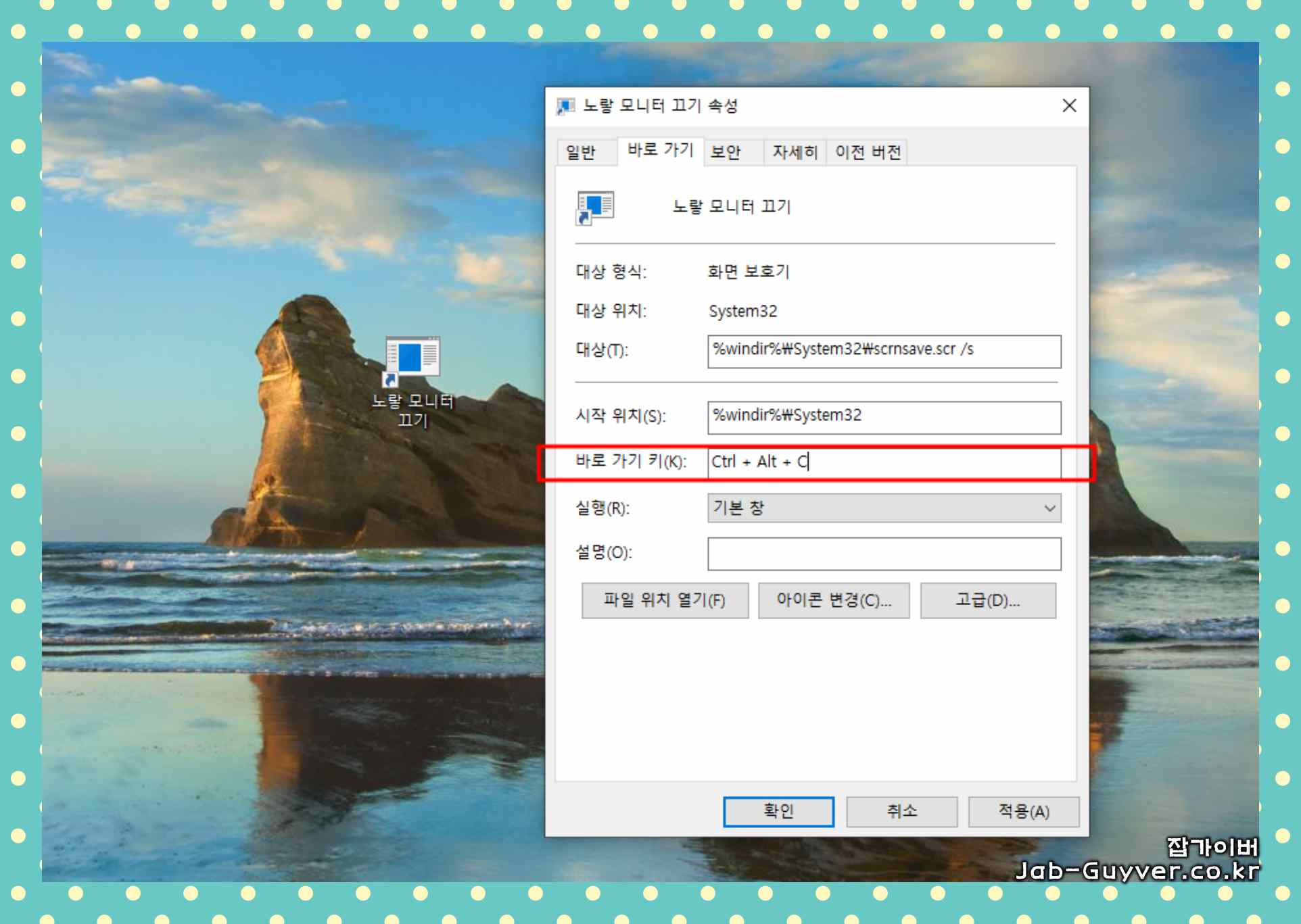 "바로가기" 탭에서 "바로가기 키"란에 원하는 단축키를 설정합니다.