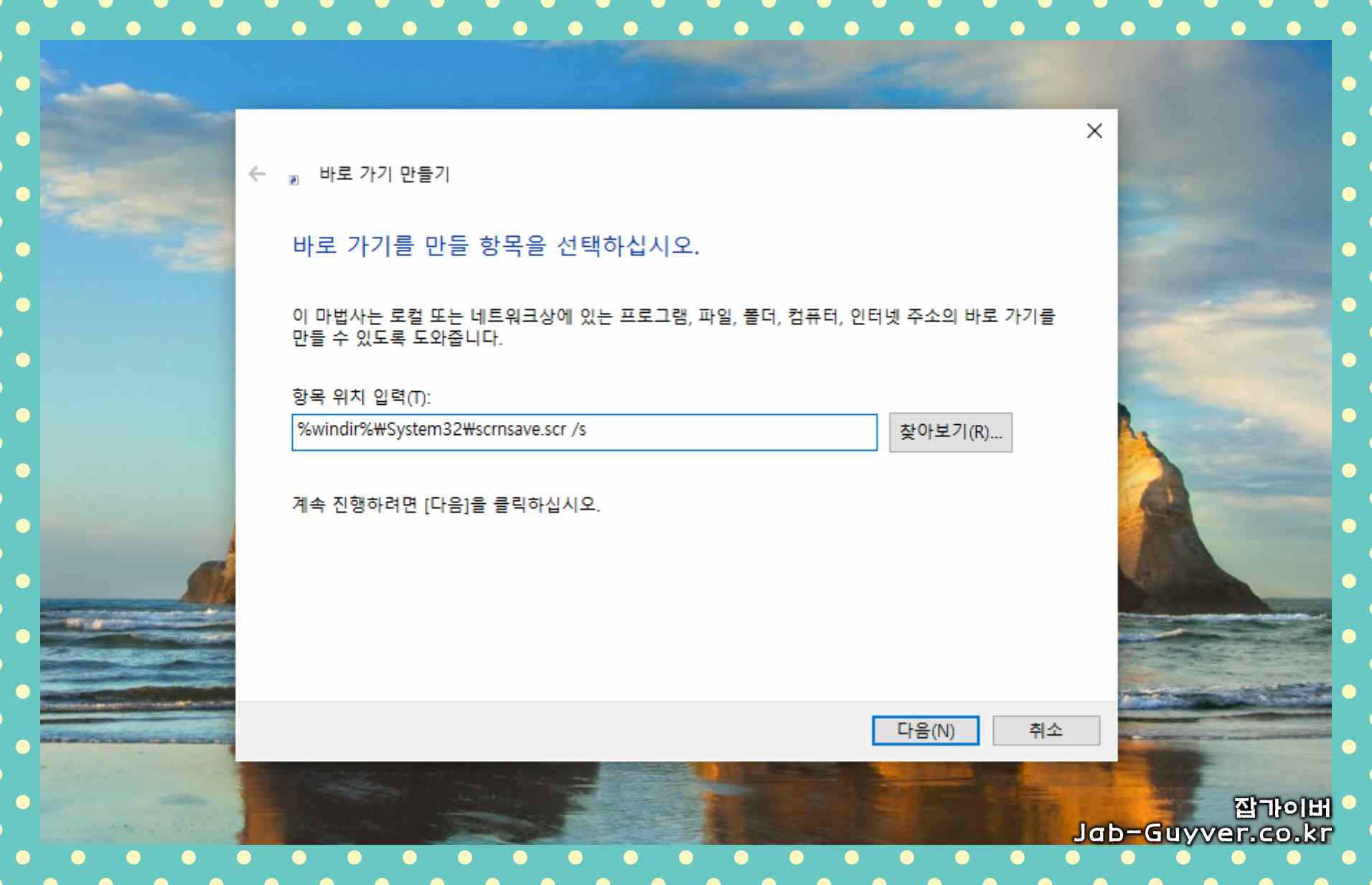 "바로 가기 만들기" 창에서 "항목 위치 입력"란에 다음과 같은 실행 명령어를 입력합니다.