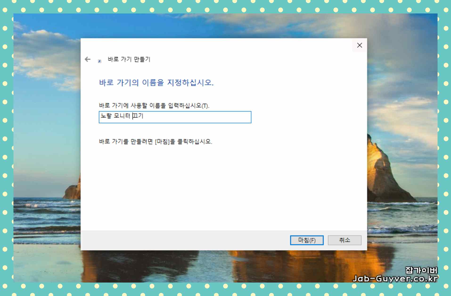 명령어 입력이 완료되었다면 원하는 이름(예: "모니터 끄기" 또는 "모니터 절전모드")을 입력하고 "마침" 버튼을 클릭하여 바로가기 파일(.lnk)을 생성합니다.