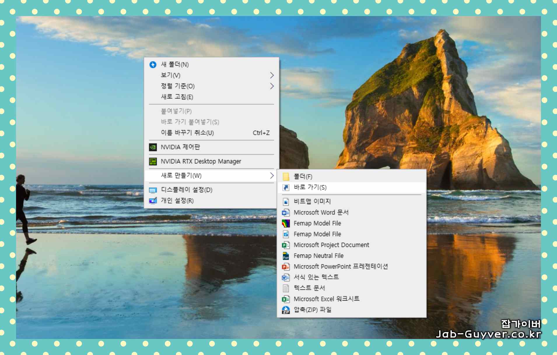 바탕화면에서 마우스 우클릭을 하고 "새로 만들기" - "바로 가기"를 선택합니다.
