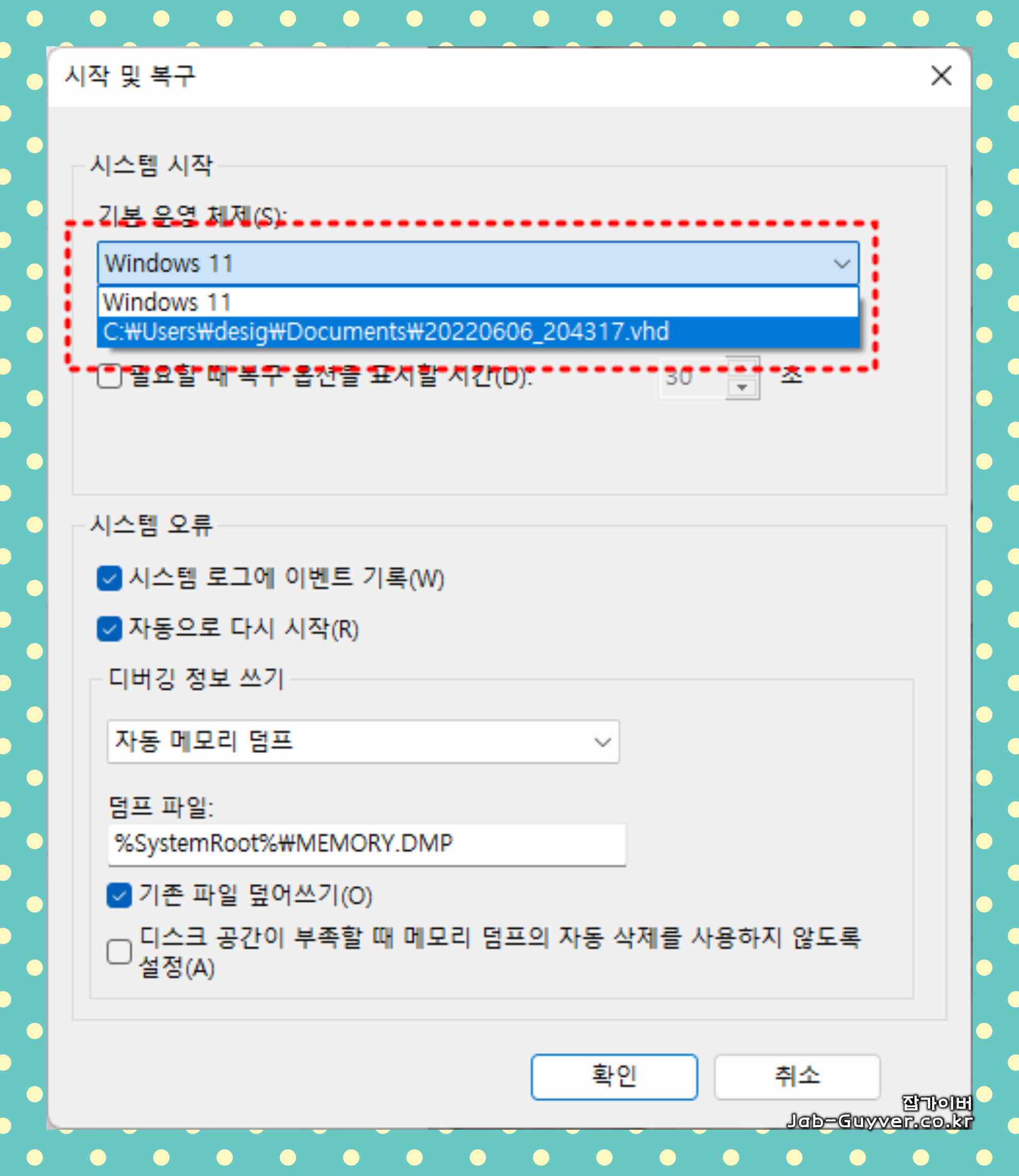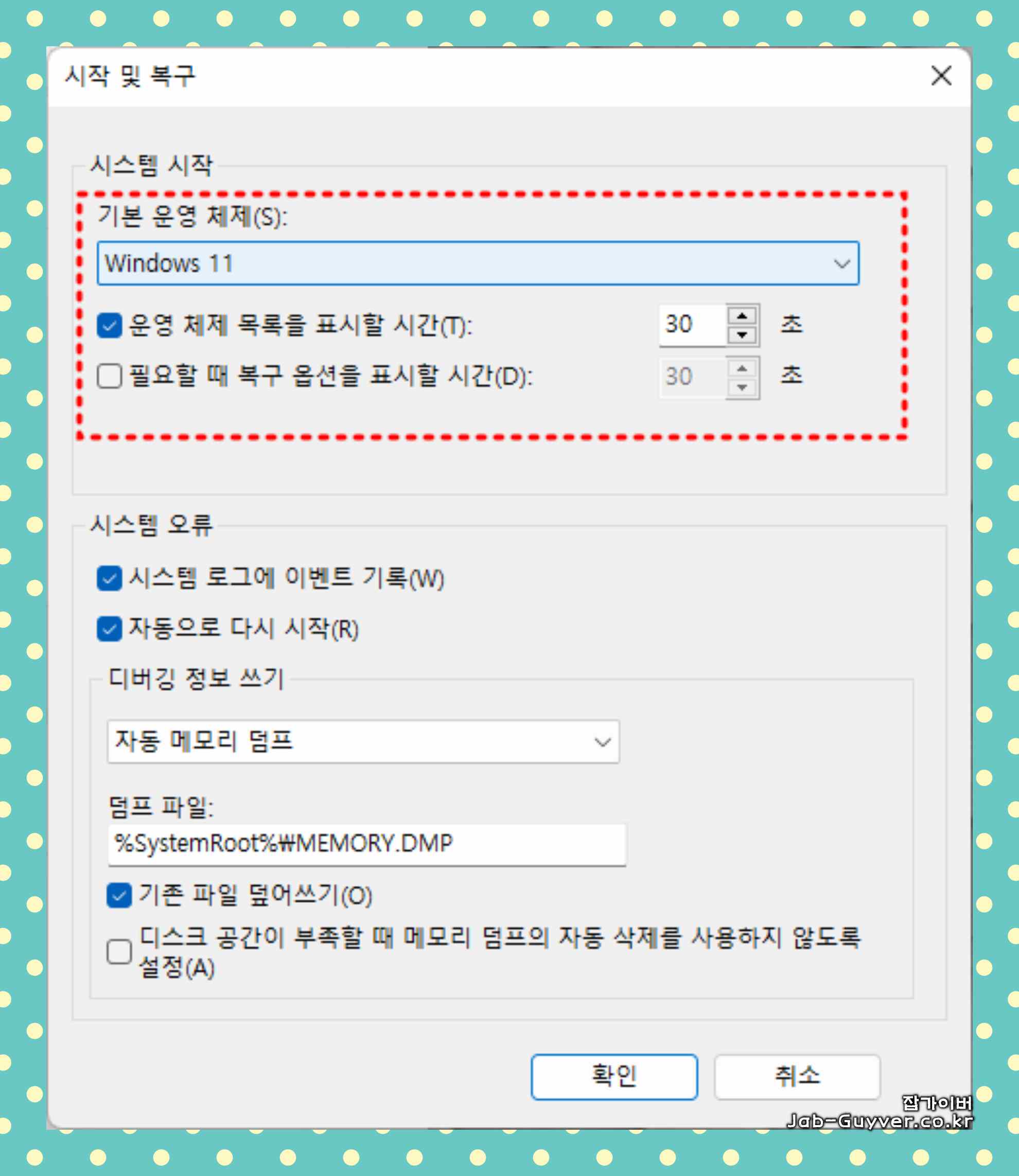 시작 및 복구에서 "시스템 시작" 부분에 보이는 운영체제를 선택 할 수 있으며 멀티부팅 목록이 나타나는 시간을 조절하려면 "운영 체제 목록을 표시할 시간" 부분의 초를 변경하거나, 목록 표시 없이 기본 OS로 바로 부팅하고 싶다면 체크를 해제하면 됩니다.