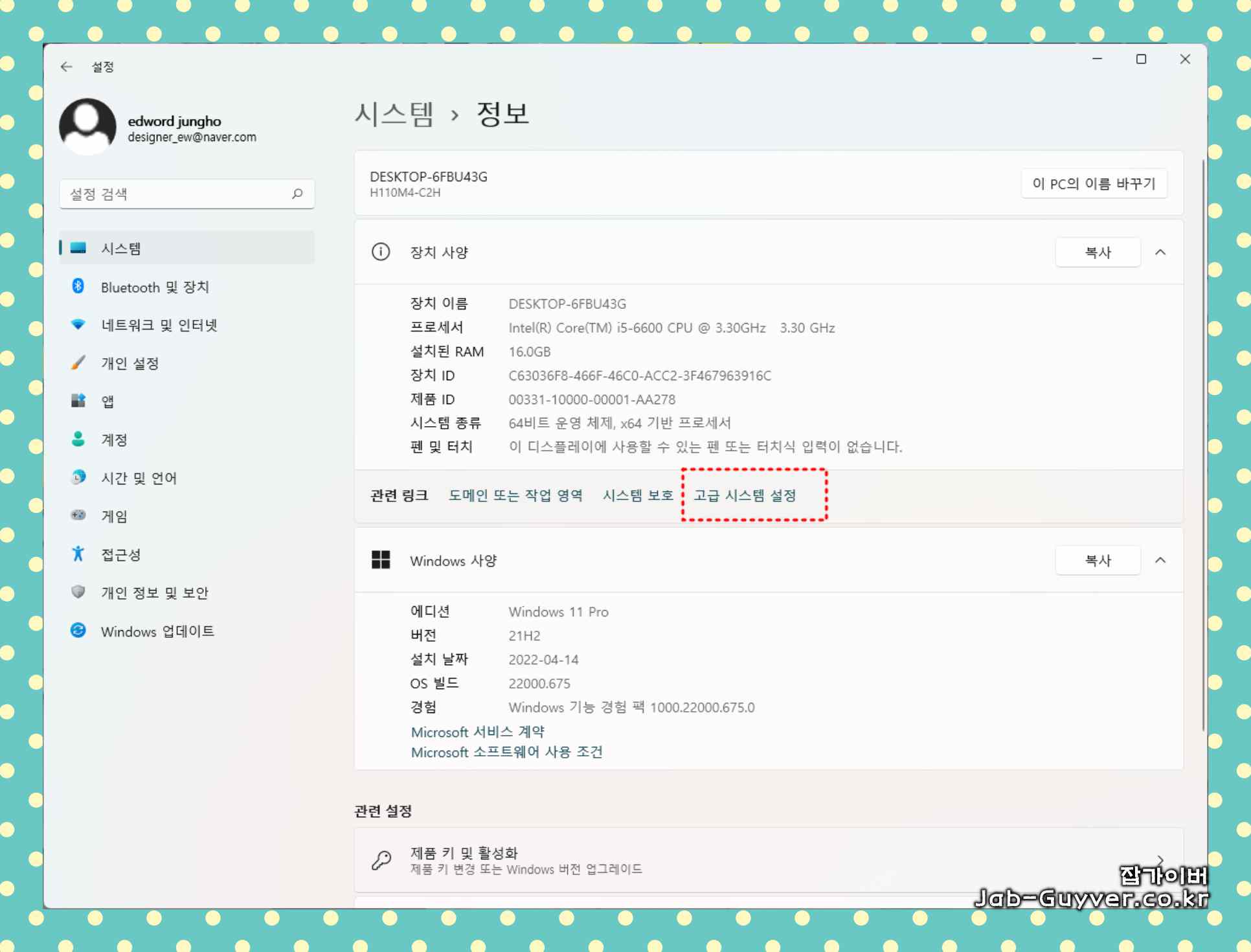 윈도우11 시작아이콘에서 시스템 -> 고급시스템 설정으로 들어갑니다.