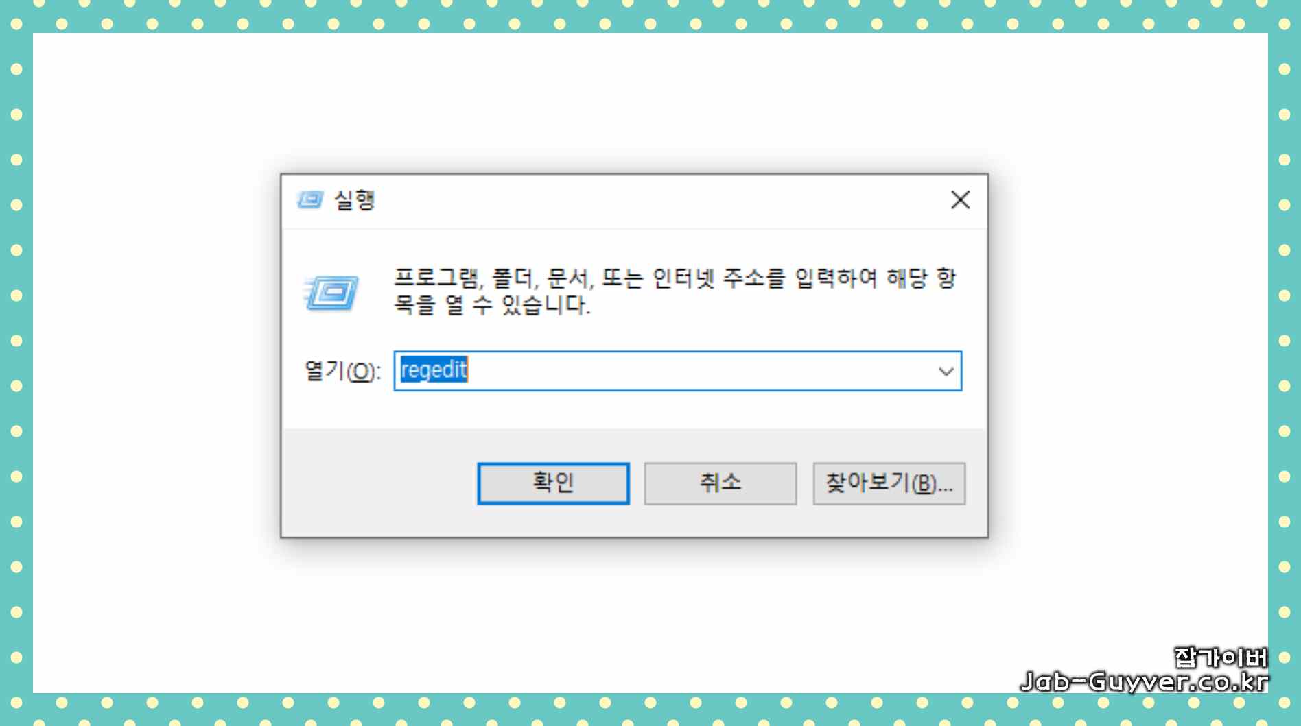 "regedit"를 입력하고 Enter 키를 눌러 레지스트리 편집기를 실행 후 아래 경로로 이동합니다.