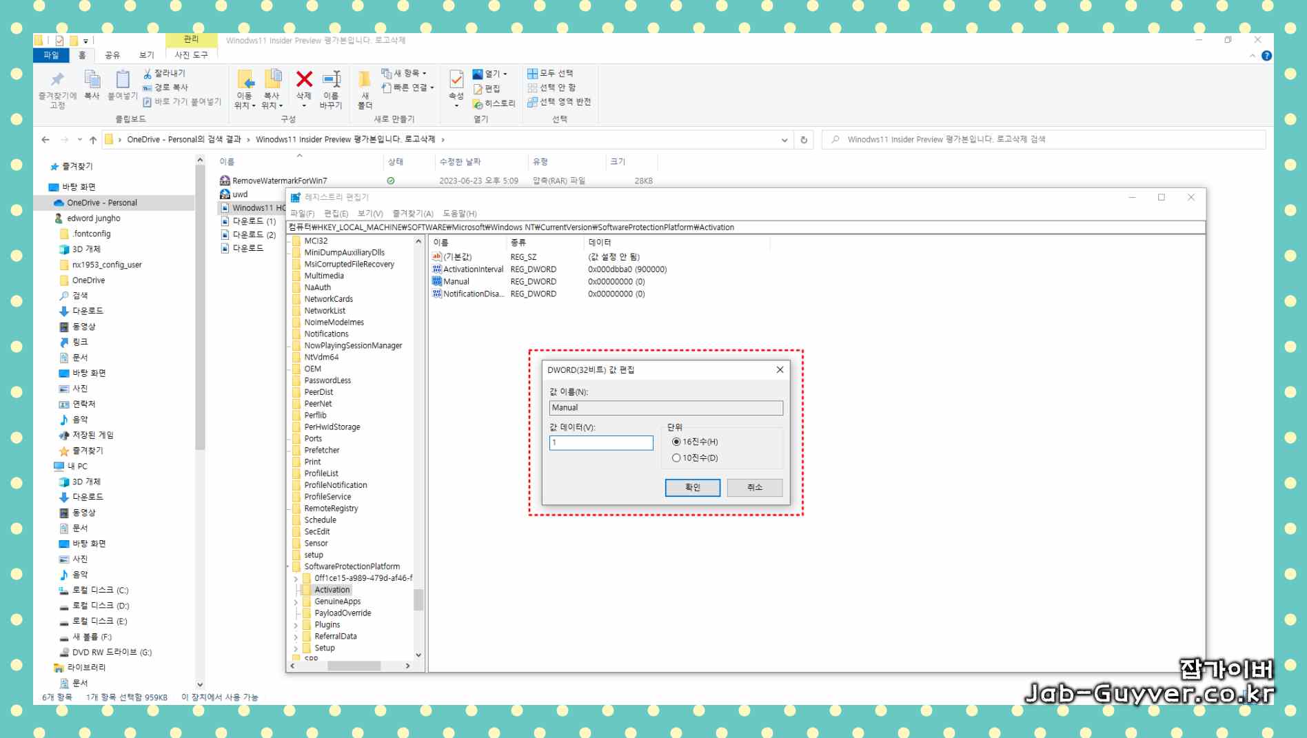 레지스트리 변경 후에도 워터마크가 사라지지 않는다면 다음을 확인해보세요.