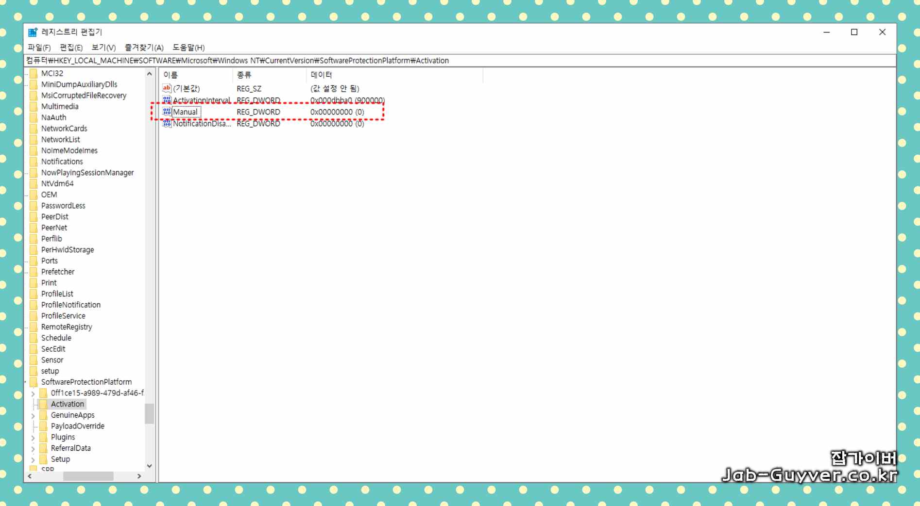 - "Manual" 값 외에 다른 항목도 영향을 줄 수 있기 때문에 백업 후 전체 SoftwareProtectionPlatform 경로를 점검하는 것이 좋습니다.