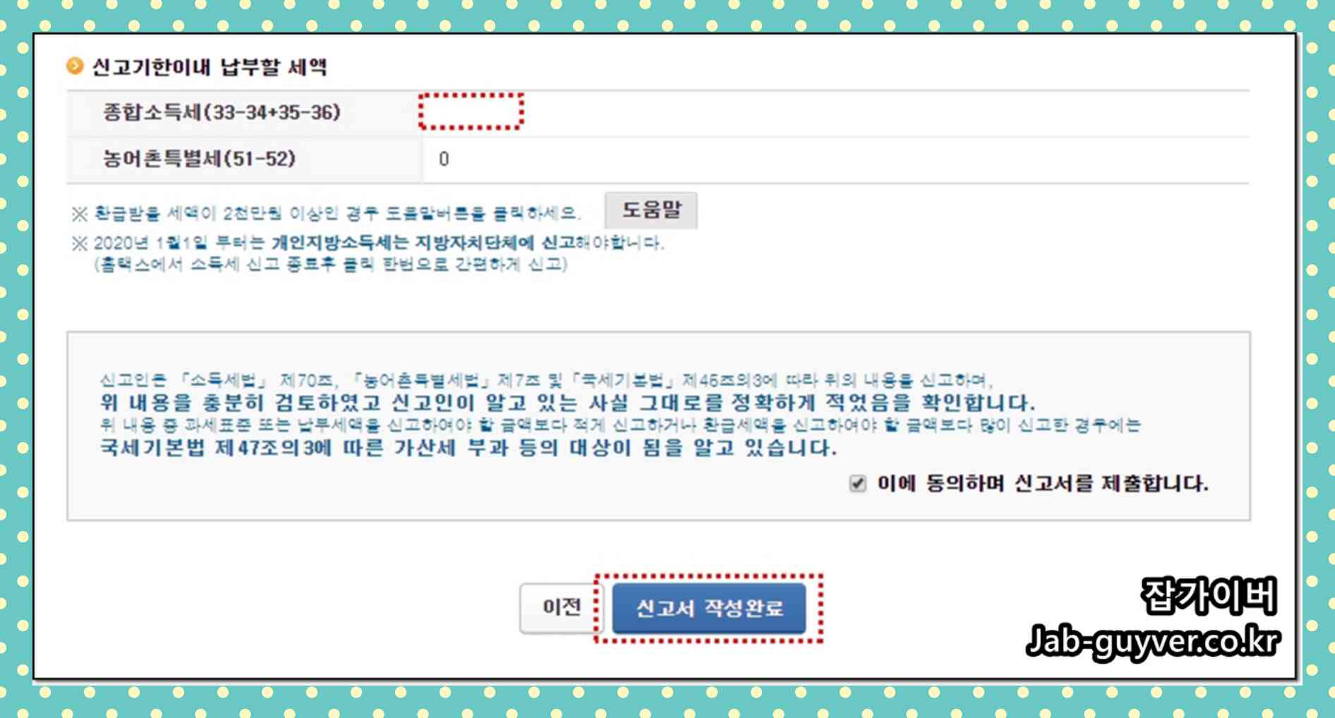 최종적으로 납부해야 할 세액을 확인하고 정보 제공 동의에 체크한 후 신고서 제출하기 버튼을 눌러 신고를 마칩니다.