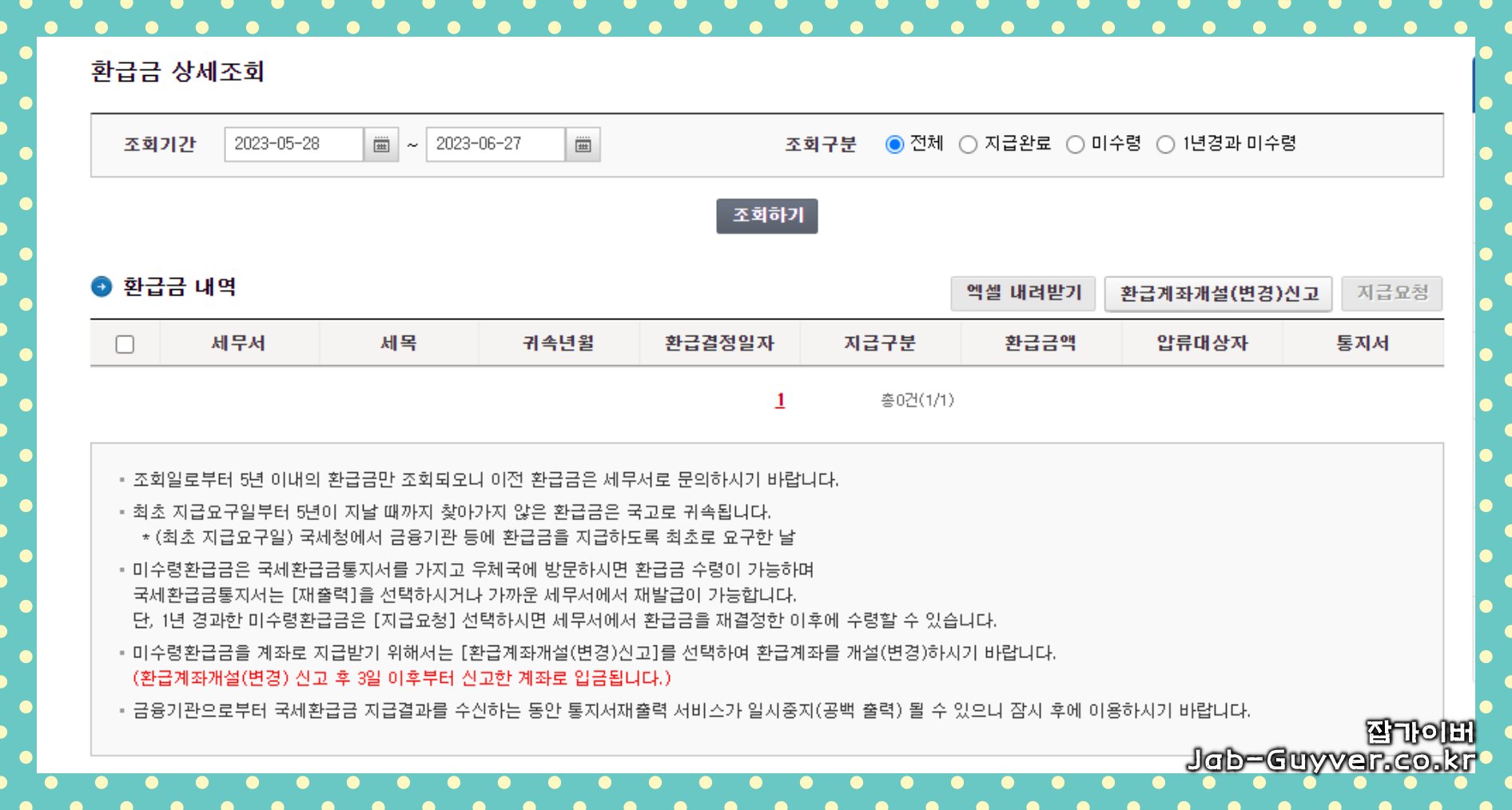 • 조회일로부터 5년 이내의 환급금만 홈택스에서 조회 가능합니다.