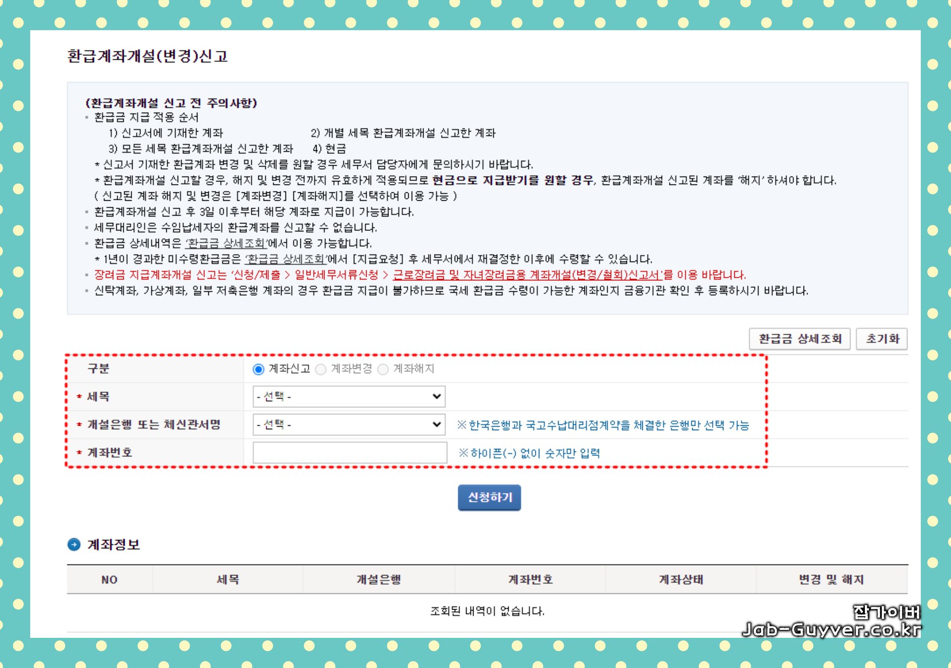 - 계좌번호 변경을 원하실 경우, 신속하게 변경 신고를 해주셔야 합니다.